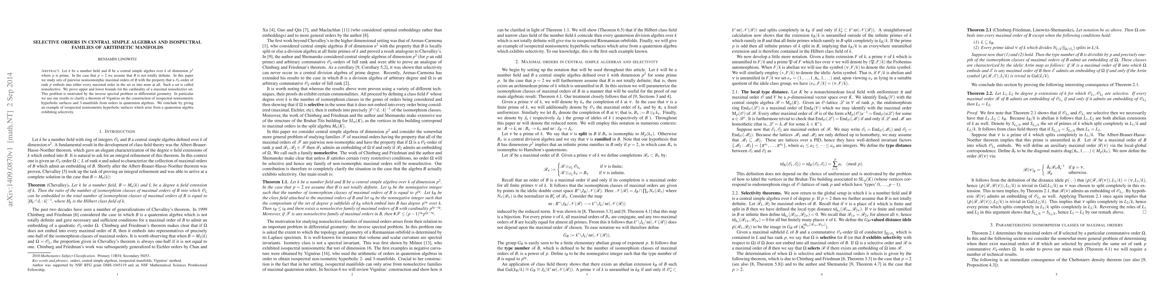 Let $k$ be a number field and $B$ be a central simple algebra over $k$ of dimension $p^2$ where $p$ is prime. In the case that $p=2$ we assume that $B$ is not totally definite. In this paper we study sets of pairwise nonisomorphic maximal orders of $B$ with the property that a $\mathcal{O}_k$-order of rank $p$ embeds into either every maximal order in the set or into none at all. Such a set is called nonselective. We prove upper and lower bounds for the cardinality of a maximal nonselective set. This problem is motivated by the inverse spectral problem in differential geometry. In particular we use our results to clarify a theorem of Vign{\'e}ras on the construction of isospectral nonisometric hyperbolic surfaces and $3$-manifolds from orders in quaternion algebras. We conclude by giving an example of isospectral nonisometric hyperbolic surfaces which arise from a quaternion algebra exhibiting selectivity.