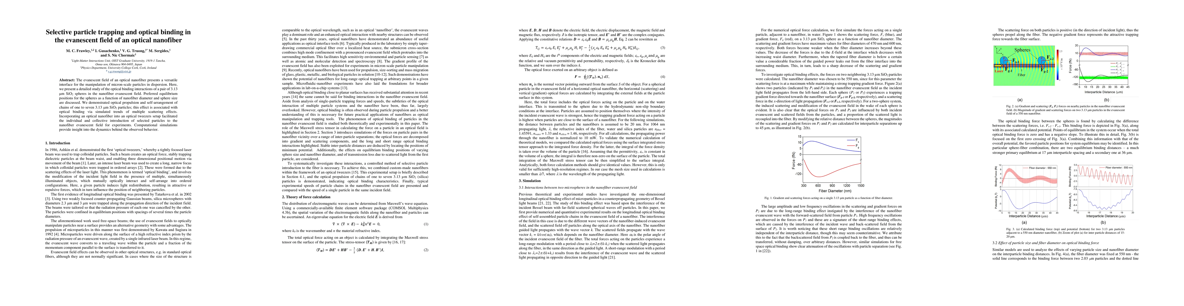 This paper explores the manipulation of micron-scale SiO$_2$ particles using the evanescent field of an optical nanofiber, demonstrating optical binding, propulsion, and self-arrangement of particle chains. Computational simulations elucidate the dynamics of these interactions and the influence of nanofiber diameter and particle size on equilibrium positions.