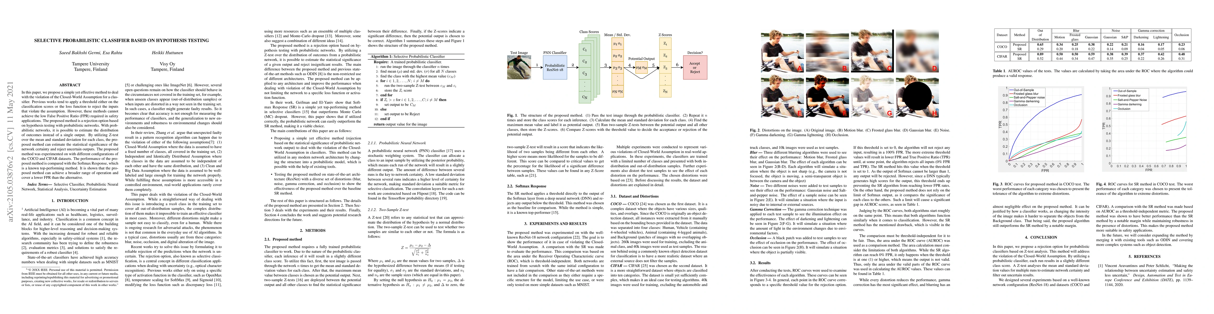 This paper introduces a new method using hypothesis testing with probabilistic networks to handle violations of the Closed-World Assumption in classifiers. The proposed Z-test based approach estimates network certainty's statistical significance, enabling the rejection of uncertain outputs, thus achieving lower False Positive Ratios (FPR) than existing methods like Softmax Response, as demonstrated through experiments on COCO and CIFAR datasets.