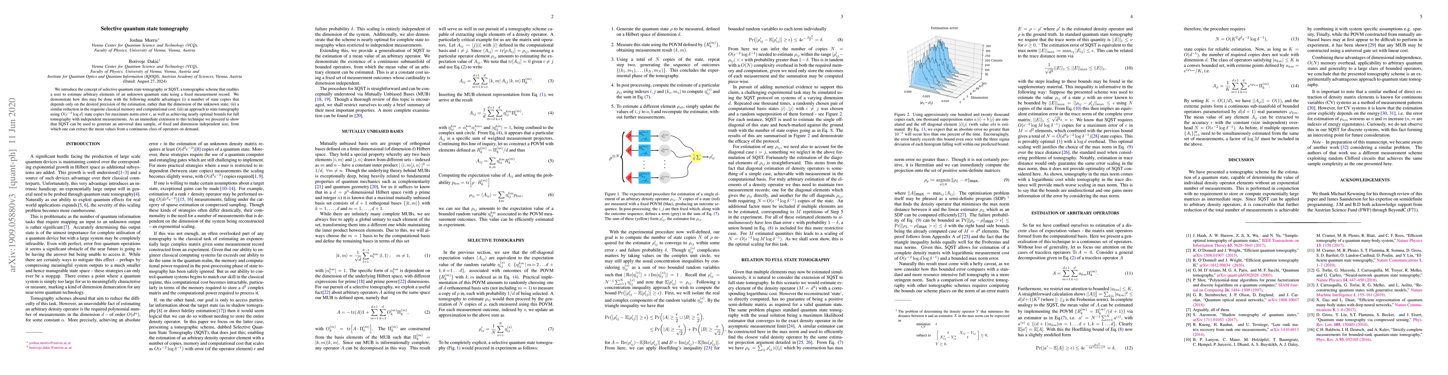 We introduce the concept of selective quantum state tomography or SQST, a tomographic scheme that enables a user to estimate arbitrary elements of an unknown quantum state using a fixed measurement record. We demonstrate how this may be done with the following notable advantages (i) a number of state copies that depends only on the desired precision of the estimation, rather than the dimension of the unknown state; (ii) a similar reduction in the requisite classical memory and computational cost; (iii) an approach to state tomography using $O(\epsilon^{-2}\log d)$ state copies for maximum norm error $\epsilon$, as well as achieving nearly optimal bounds for full tomography with independent measurements. As an immediate extension to this technique we proceed to show that SQST can be used to generate an universal data sample, of fixed and dimension independent size, from which one can extract the mean values from a continuous class of operators on demand.
