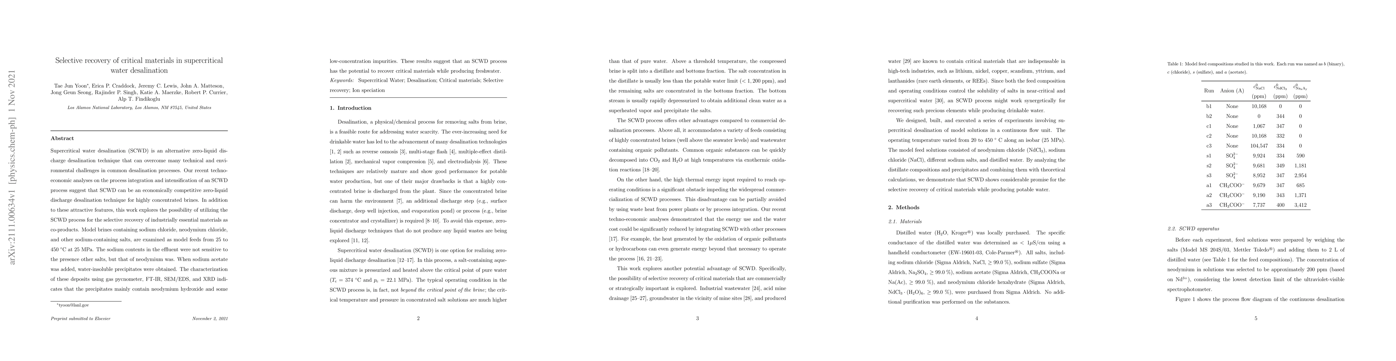 The study investigates the selective recovery of critical materials like neodymium chloride using supercritical water desalination (SCWD), demonstrating its potential to produce freshwater while co-extracting valuable metals. The process shows selective precipitation of neodymium hydroxide when sodium acetate is added, indicating SCWD's capability for dual resource recovery.