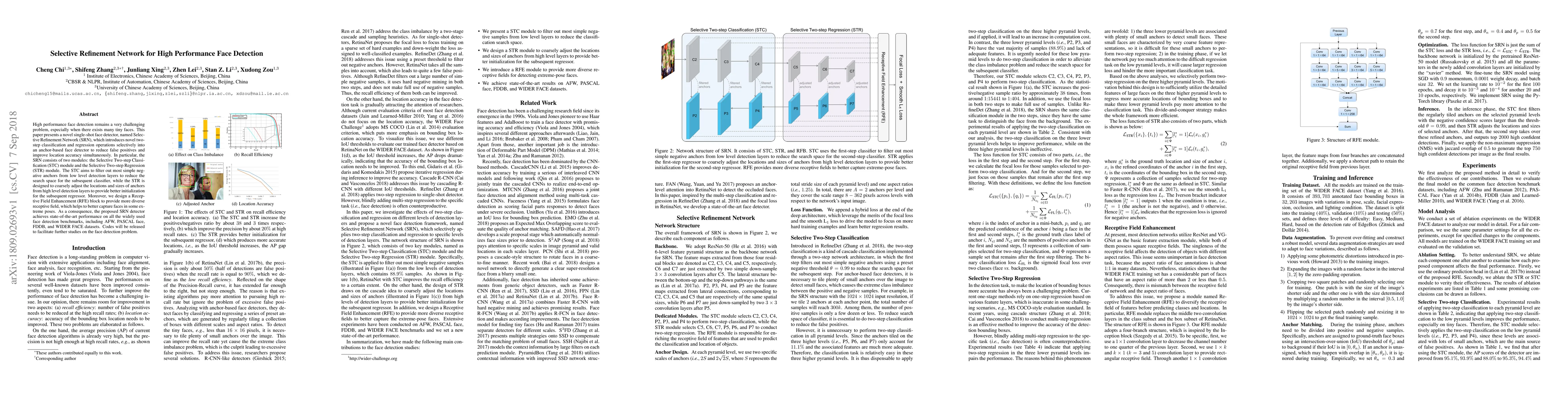 The Selective Refinement Network (SRN) introduces a novel two-step classification and regression approach to enhance face detection performance, particularly for tiny faces. The SRN achieves state-of-the-art results on multiple benchmarks by filtering negative anchors and refining anchor locations and sizes.