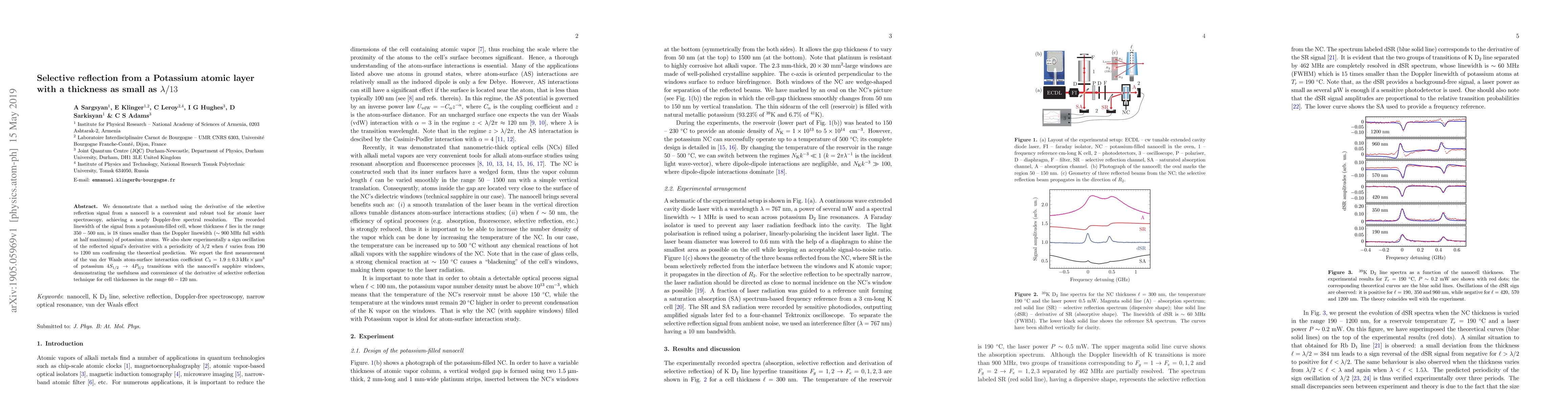 We demonstrate that a method using the derivative of the selective reflection signal from a nanocell is a convenient and robust tool for atomic laser spectroscopy, achieving a nearly Doppler-free spectral resolution. The recorded linewidth of the signal from a potassium-filled cell, whose thickness $\ell$ lies in the range $350-500$ nm, is 18 times smaller than the Doppler linewidth ($\sim 900$ MHz full width at half maximum) of potassium atoms. We also show experimentally a sign oscillation of the reflected signal's derivative with a periodicity of $\lambda/2$ when $\ell$ varies from 190 to 1200~nm confirming the theoretical prediction. We report the first measurement of the van der Waals atom-surface interaction coefficient $C_3 = 1.9\pm 0.3$ kHz$\cdot\mu$m$^3$ of potassium $4S_{1/2} \rightarrow 4P_{3/2}$ transitions with the nanocell's sapphire windows, demonstrating the usefulness and convenience of the derivative of selective reflection technique for cell thicknesses in the range $60 -120~$nm.