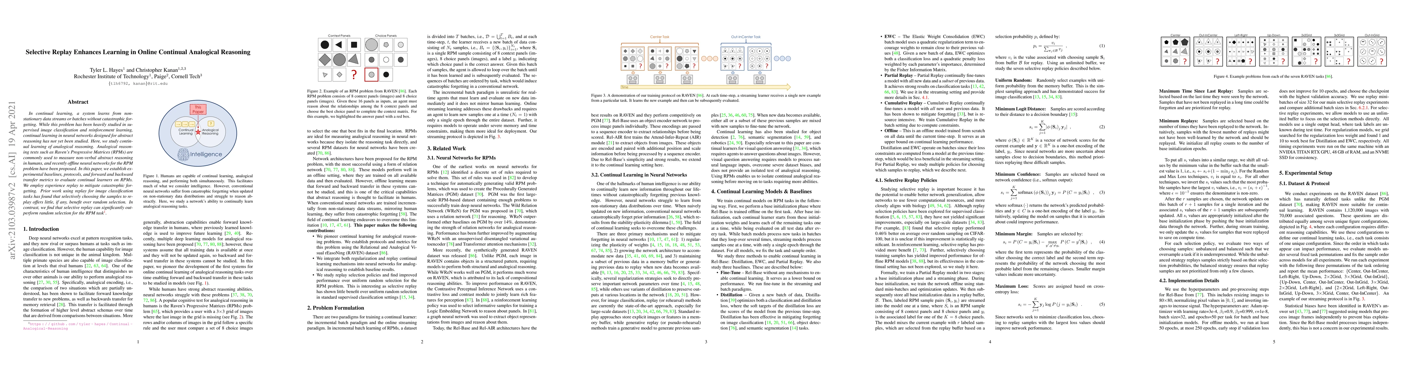 This paper investigates continual learning for analogical reasoning, specifically in the context of Raven's Progressive Matrices (RPMs). It finds that selective replay, as opposed to random selection, significantly enhances learning performance in neural networks tasked with continual analogical reasoning, contrasting with prior findings in image classification.