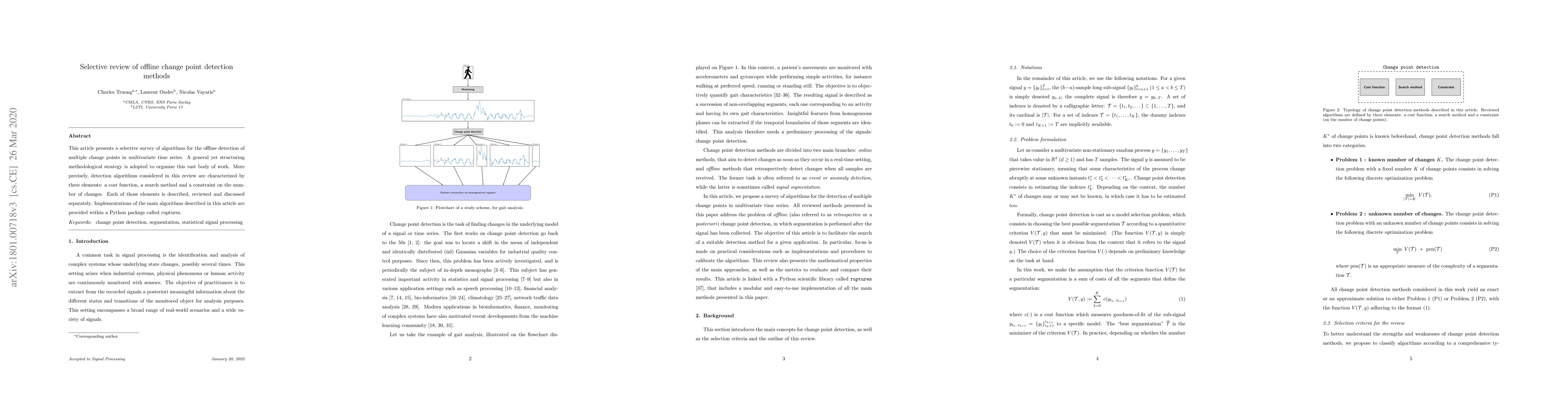 This paper surveys offline algorithms for detecting multiple change points in multivariate time series, categorizing them by cost function, search method, and change constraints. It also introduces a Python package, ruptures, for implementing these algorithms.