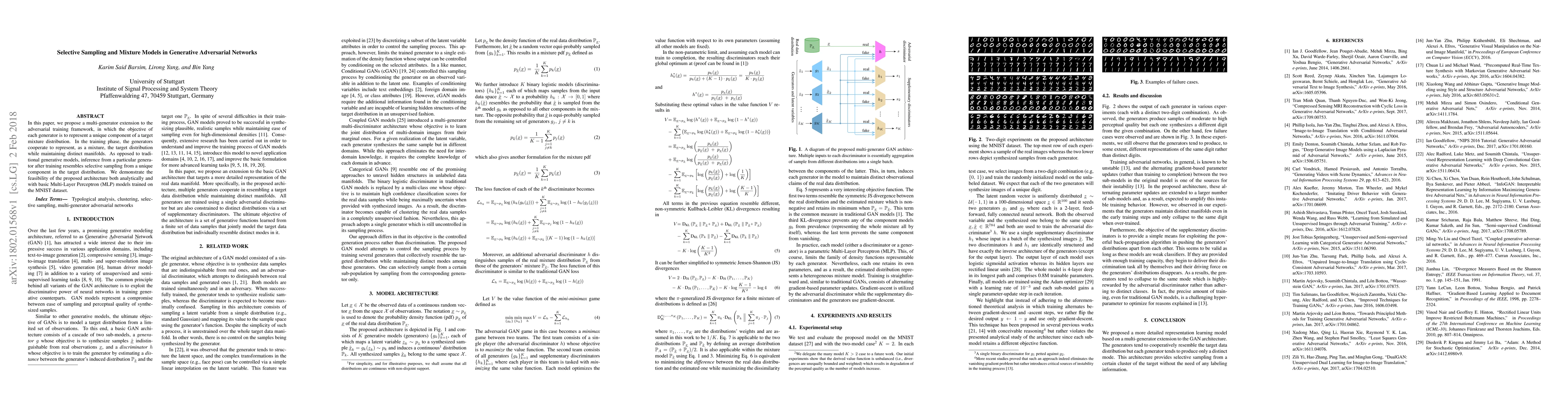 This paper introduces a multi-generator extension to GANs where each generator represents a unique component of a target mixture distribution. The trained model allows selective sampling from specific components, demonstrated through MLP models on the MNIST dataset.