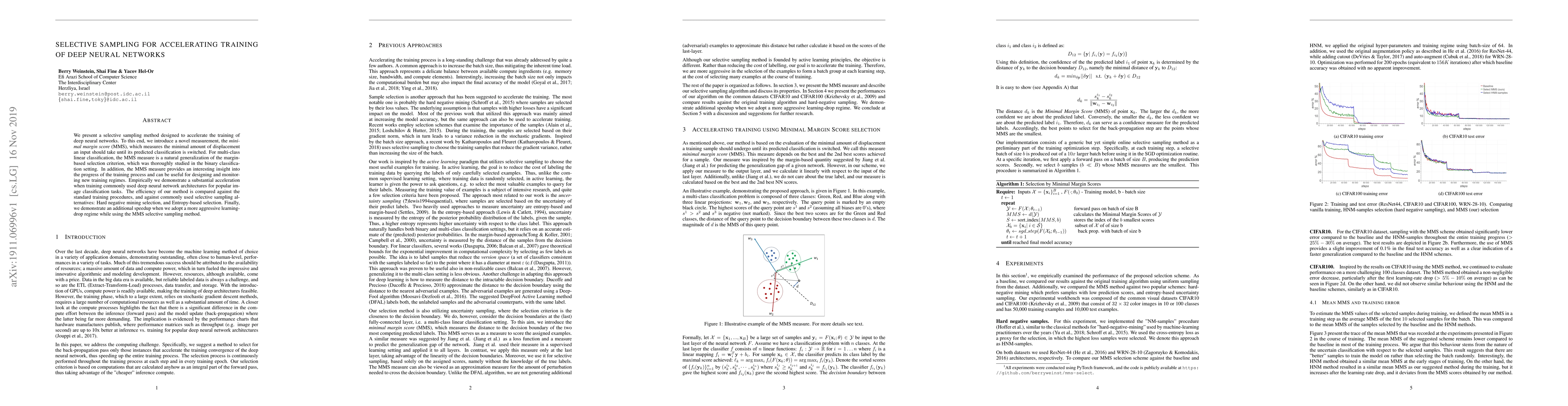 The research introduces a selective sampling method for accelerating deep neural network training, utilizing a novel measurement called the Minimal Margin Score (MMS) that quantifies the minimal displacement an input requires to switch its predicted classification.
