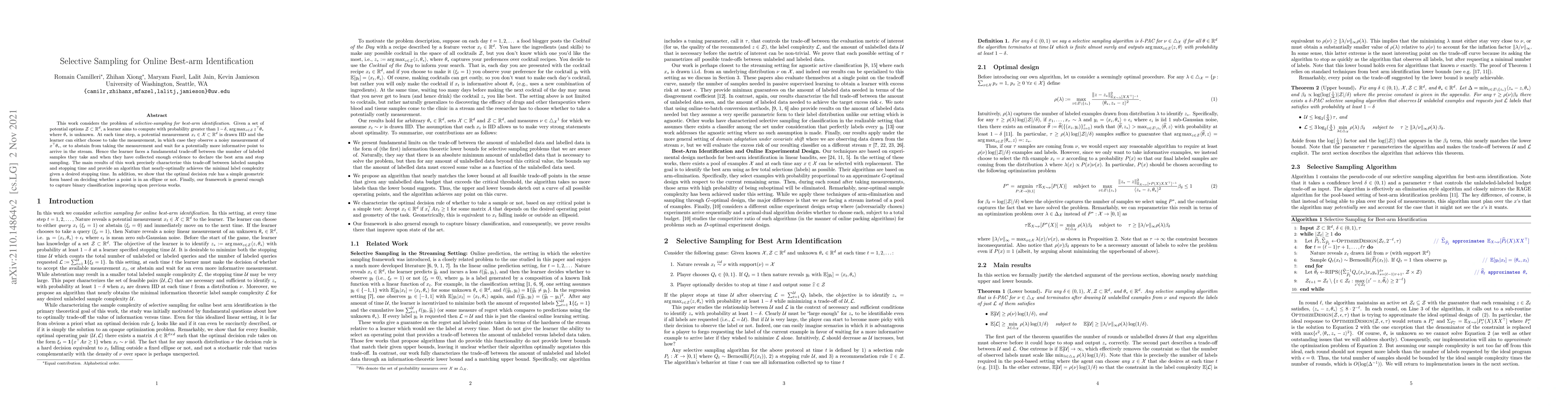 This work considers the problem of selective-sampling for best-arm identification. Given a set of potential options $\mathcal{Z}\subset\mathbb{R}^d$, a learner aims to compute with probability greater than $1-\delta$, $\arg\max_{z\in \mathcal{Z}} z^{\top}\theta_{\ast}$ where $\theta_{\ast}$ is unknown. At each time step, a potential measurement $x_t\in \mathcal{X}\subset\mathbb{R}^d$ is drawn IID and the learner can either choose to take the measurement, in which case they observe a noisy measurement of $x^{\top}\theta_{\ast}$, or to abstain from taking the measurement and wait for a potentially more informative point to arrive in the stream. Hence the learner faces a fundamental trade-off between the number of labeled samples they take and when they have collected enough evidence to declare the best arm and stop sampling. The main results of this work precisely characterize this trade-off between labeled samples and stopping time and provide an algorithm that nearly-optimally achieves the minimal label complexity given a desired stopping time. In addition, we show that the optimal decision rule has a simple geometric form based on deciding whether a point is in an ellipse or not. Finally, our framework is general enough to capture binary classification improving upon previous works.