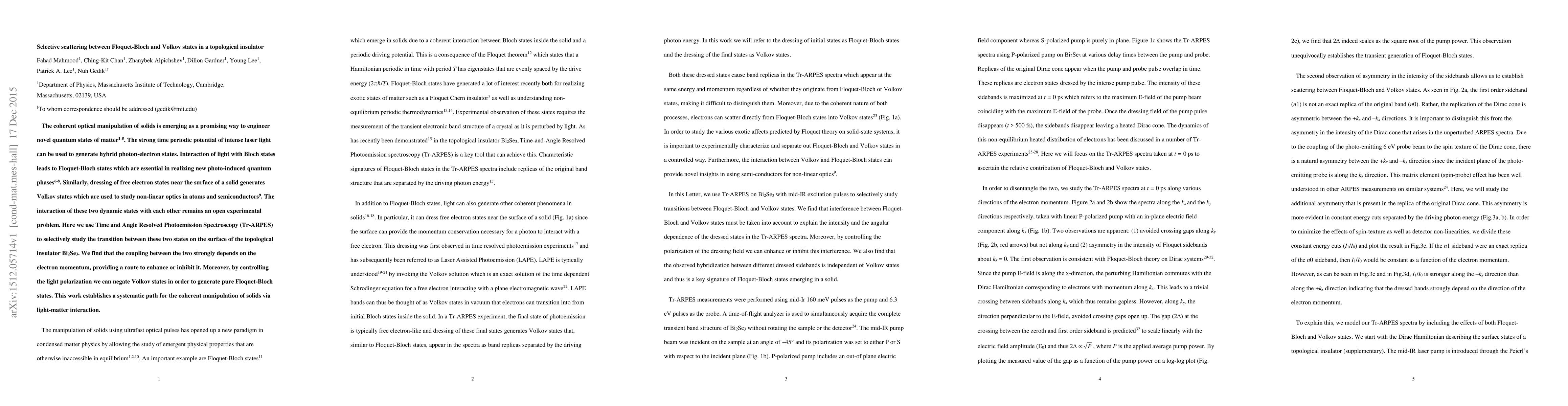 The coherent optical manipulation of solids is emerging as a promising way to engineer novel quantum states of matter. The strong time periodic potential of intense laser light can be used to generate hybrid photon-electron states. Interaction of light with Bloch states leads to Floquet-Bloch states which are essential in realizing new photo-induced quantum phases. Similarly, dressing of free electron states near the surface of a solid generates Volkov states which are used to study non-linear optics in atoms and semiconductors. The interaction of these two dynamic states with each other remains an open experimental problem. Here we use Time and Angle Resolved Photoemission Spectroscopy (Tr-ARPES) to selectively study the transition between these two states on the surface of the topological insulator Bi2Se3. We find that the coupling between the two strongly depends on the electron momentum, providing a route to enhance or inhibit it. Moreover, by controlling the light polarization we can negate Volkov states in order to generate pure Floquet-Bloch states. This work establishes a systematic path for the coherent manipulation of solids via light-matter interaction.