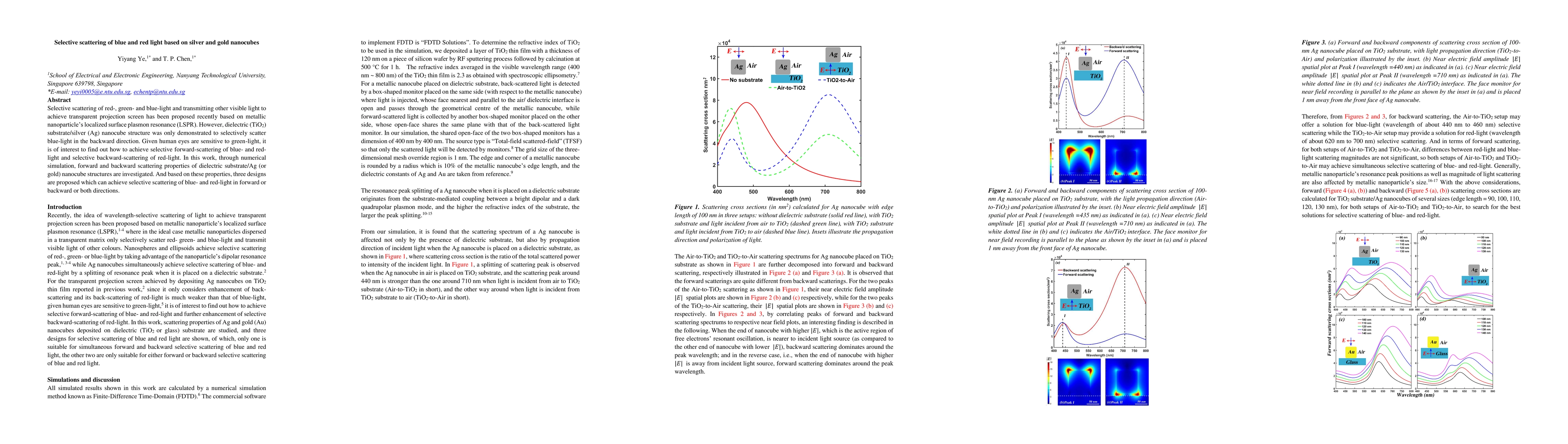 Selective scattering of red-, green- and blue-light and transmitting other visible light to achieve transparent projection screen has been proposed recently based on metallic nanoparticle's localized surface plasmon resonance (LSPR). However, dielectric (TiO2) substrate/silver (Ag) nanocube structure was only demonstrated to selectively scatter blue-light in the backward direction. Given human eyes are sensitive to green-light, it is of interest to find out how to achieve selective forward-scattering of blue- and red-light and selective backward-scattering of red-light. In this work, through numerical simulation, forward and backward scattering properties of dielectric substrate/Ag (or gold) nanocube structures are investigated. And based on these properties, three designs are proposed which can achieve selective scattering of blue- and red-light in forward or backward or both directions.
