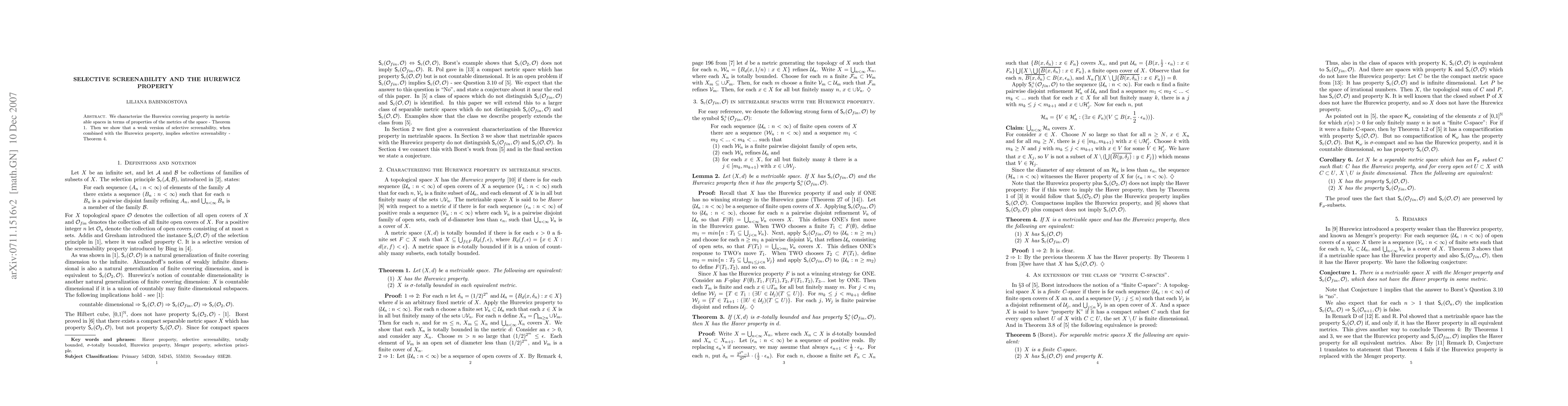 The paper characterizes the Hurewicz covering property in metrizable spaces using metric properties and demonstrates that selective screenability follows from a weak version of selective screenability when paired with the Hurewicz property.