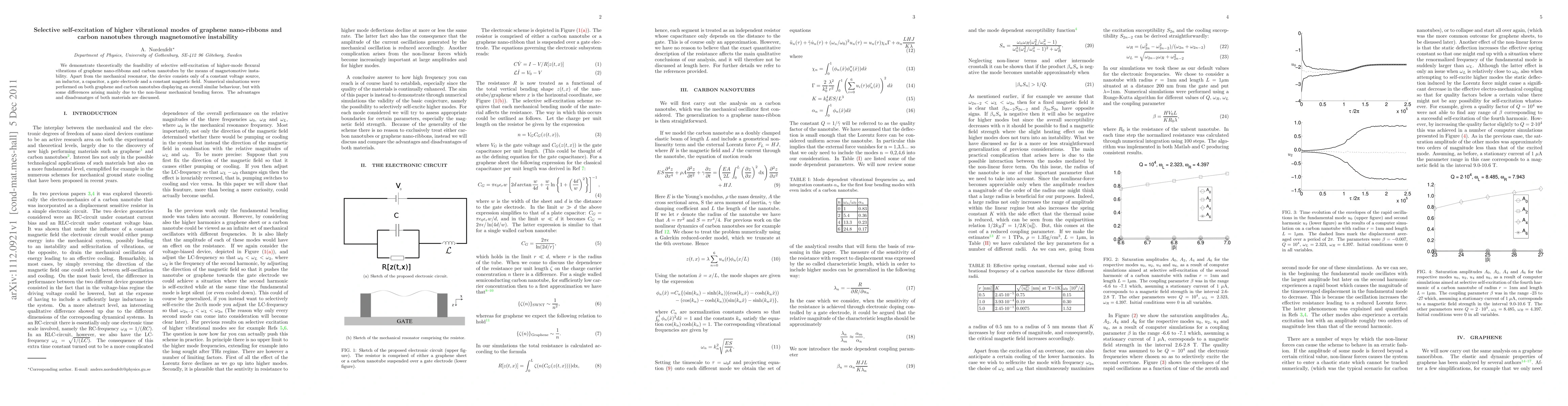 This paper theoretically explores the selective excitation of higher vibrational modes in graphene nano-ribbons and carbon nanotubes via magnetomotive instability, using a simple device setup. Numerical simulations reveal similar behavior but highlight differences due to non-linear mechanical bending forces, with a discussion of the pros and cons of each material.