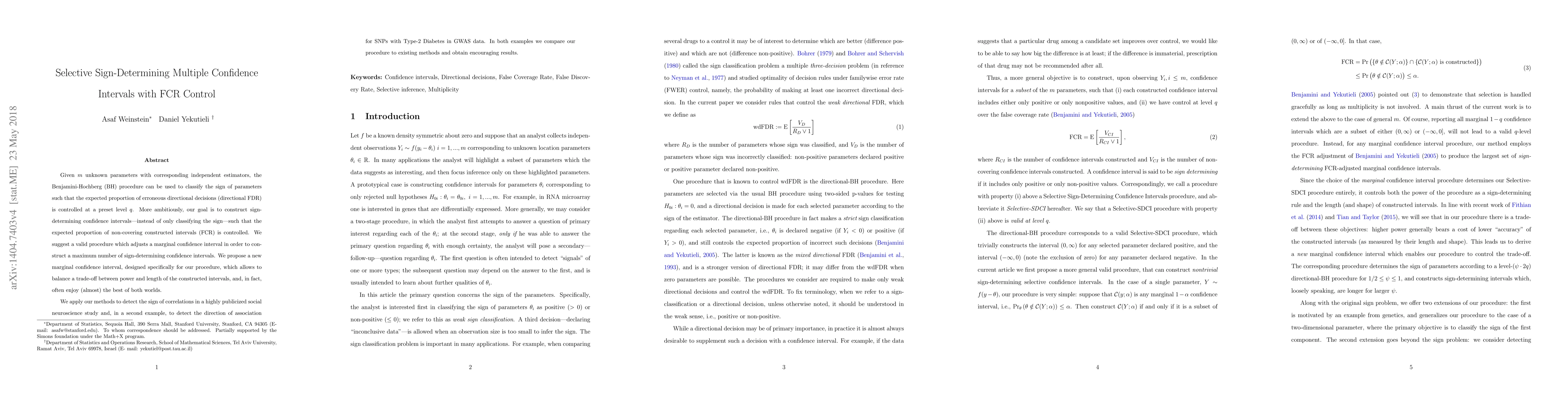 Given $m$ unknown parameters with corresponding independent estimators, the Benjamini-Hochberg (BH) procedure can be used to classify the sign of parameters such that the expected proportion of erroneous directional decisions (directional FDR) is controlled at a preset level $q$. More ambitiously, our goal is to construct sign-determining confidence intervals---instead of only classifying the sign---such that the expected proportion of non-covering constructed intervals (FCR) is controlled. We suggest a valid procedure which adjusts a marginal confidence interval in order to construct a maximum number of sign-determining confidence intervals. We propose a new marginal confidence interval, designed specifically for our procedure, which allows to balance a trade-off between power and length of the constructed intervals, and, in fact, often enjoy (almost) the best of both worlds. We apply our methods to detect the sign of correlations in a highly publicized social neuroscience study and, in a second example, to detect the direction of association for SNPs with Type-2 Diabetes in GWAS data. In both examples we compare our procedure to existing methods and obtain encouraging results.