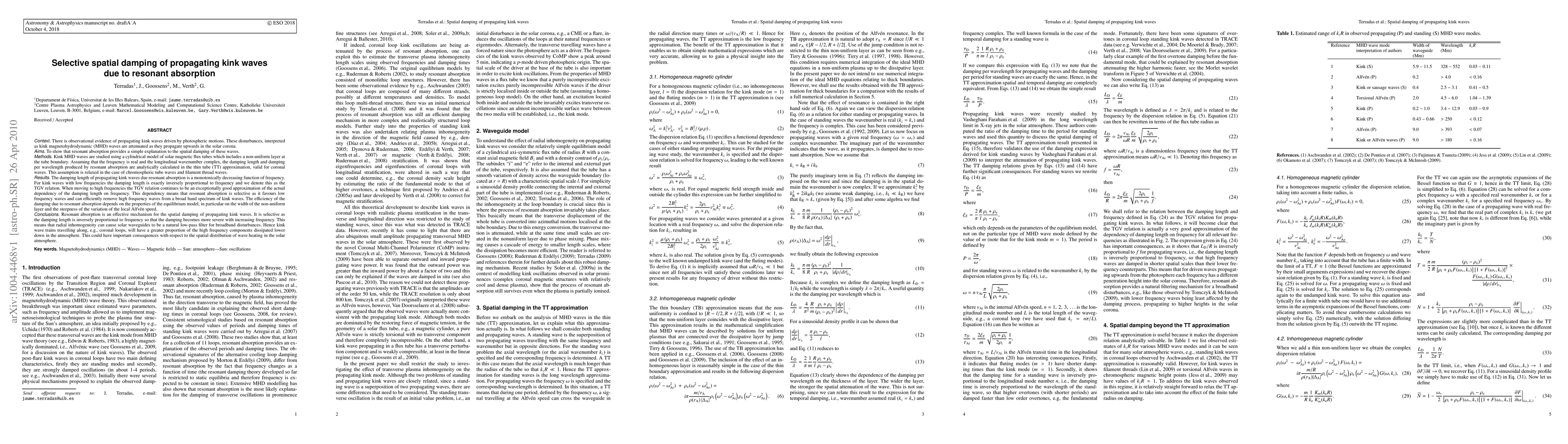 This paper demonstrates that resonant absorption explains the spatial damping of propagating kink magnetohydrodynamic waves in the solar corona. The study shows that resonant absorption selectively attenuates high-frequency waves, acting as a natural low-pass filter in solar waveguides, which could influence the spatial distribution of wave heating in the solar atmosphere.