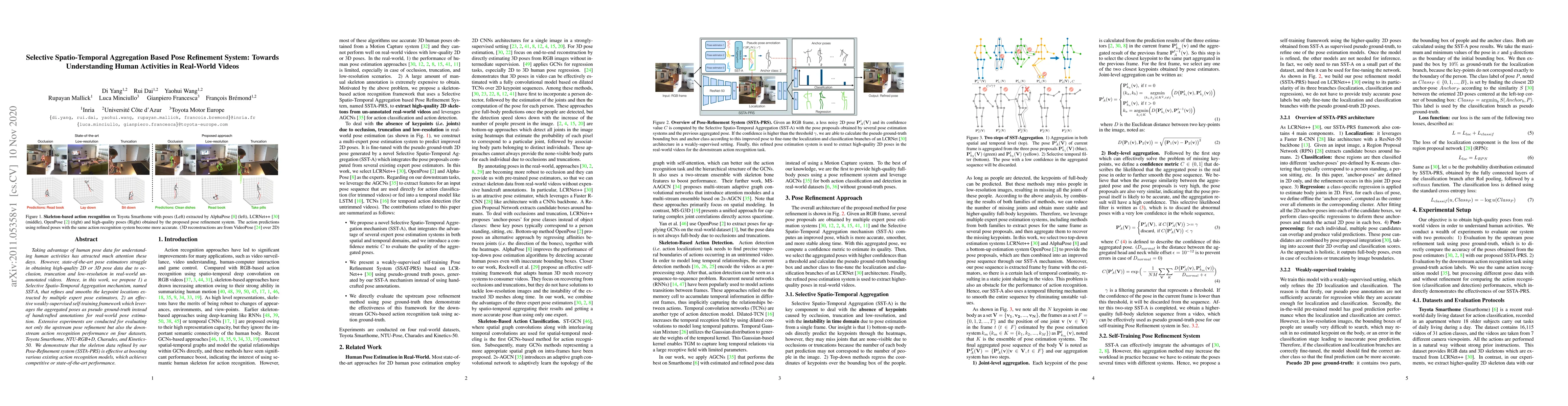 This paper proposes a Selective Spatio-Temporal Aggregation mechanism (SST-A) to refine and smooth keypoint locations from multiple pose estimators, and a self-training framework using aggregated poses as pseudo ground-truth for real-world pose estimation. The method achieves competitive action recognition performance on four datasets.