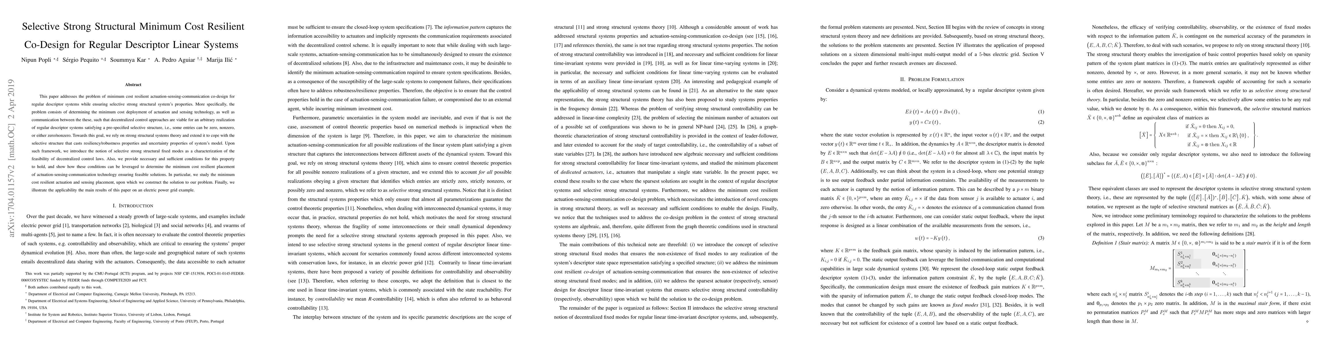 This paper develops a minimum cost resilient co-design framework for actuation, sensing, and communication in regular descriptor systems, ensuring selective strong structural properties. It provides necessary and sufficient conditions for decentralized control feasibility and applies the method to an electric power grid example.