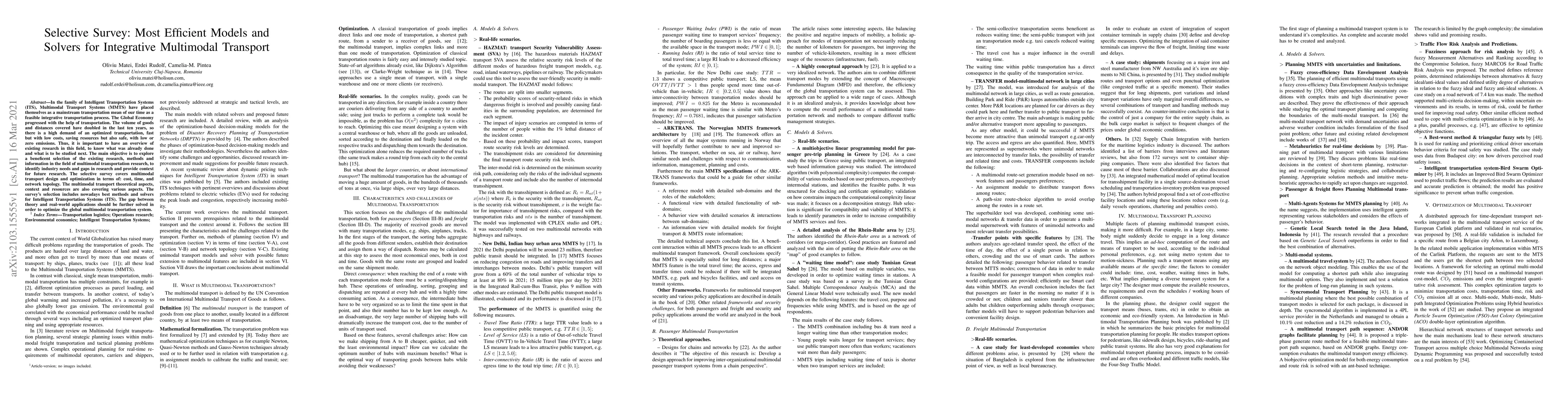 In the family of Intelligent Transportation Systems (ITS), Multimodal Transport Systems (MMTS) have placed themselves as a mainstream transportation mean of our time as a feasible integrative transportation process. The Global Economy progressed with the help of transportation. The volume of goods and distances covered have doubled in the last ten years, so there is a high demand of an optimized transportation, fast but with low costs, saving resources but also safe, with low or zero emissions. Thus, it is important to have an overview of existing research in this field, to know what was already done and what is to be studied next. The main objective is to explore a beneficent selection of the existing research, methods and information in the field of multimodal transportation research, to identify industry needs and gaps in research and provide context for future research. The selective survey covers multimodal transport design and optimization in terms of: cost, time, and network topology. The multimodal transport theoretical aspects, context and resources are also covering various aspects. The survey's selection includes nowadays best methods and solvers for Intelligent Transportation Systems (ITS). The gap between theory and real-world applications should be further solved in order to optimize the global multimodal transportation system.