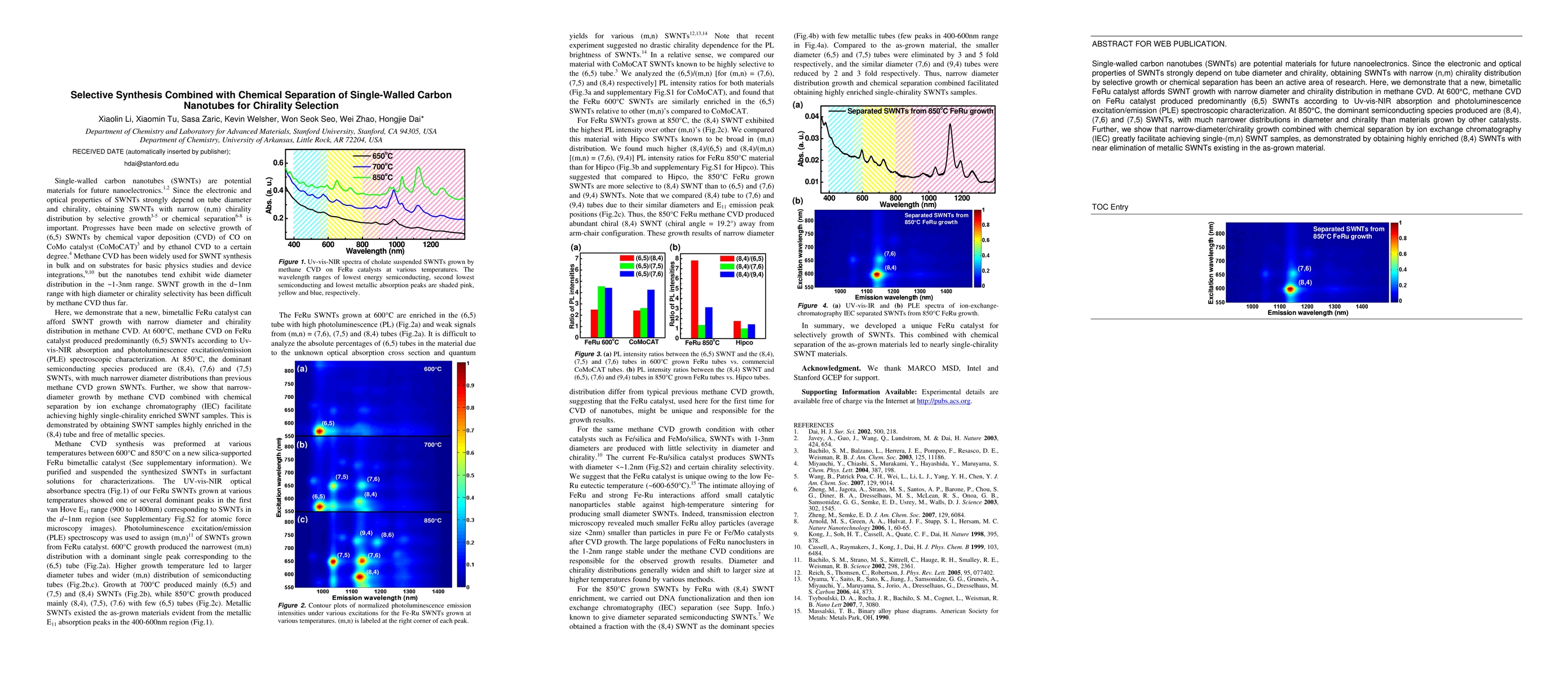 This study demonstrates selective growth of single-walled carbon nanotubes (SWNTs) using a bimetallic FeRu catalyst in methane CVD, yielding narrow diameter and chirality distributions. Additionally, combining this growth method with ion exchange chromatography allows for the production of highly enriched, single-chirality SWNT samples, such as (8,4) SWNTs.