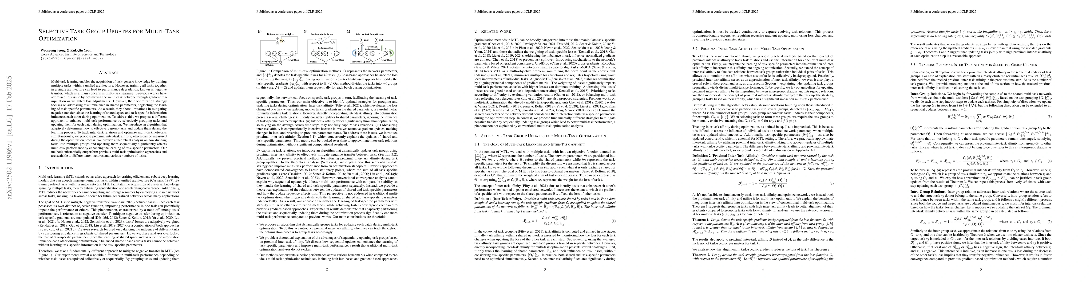 Multi-task learning enables the acquisition of task-generic knowledge by training multiple tasks within a unified architecture. However, training all tasks together in a single architecture can lead to performance degradation, known as negative transfer, which is a main concern in multi-task learning. Previous works have addressed this issue by optimizing the multi-task network through gradient manipulation or weighted loss adjustments. However, their optimization strategy focuses on addressing task imbalance in shared parameters, neglecting the learning of task-specific parameters. As a result, they show limitations in mitigating negative transfer, since the learning of shared space and task-specific information influences each other during optimization. To address this, we propose a different approach to enhance multi-task performance by selectively grouping tasks and updating them for each batch during optimization. We introduce an algorithm that adaptively determines how to effectively group tasks and update them during the learning process. To track inter-task relations and optimize multi-task networks simultaneously, we propose proximal inter-task affinity, which can be measured during the optimization process. We provide a theoretical analysis on how dividing tasks into multiple groups and updating them sequentially significantly affects multi-task performance by enhancing the learning of task-specific parameters. Our methods substantially outperform previous multi-task optimization approaches and are scalable to different architectures and various numbers of tasks.