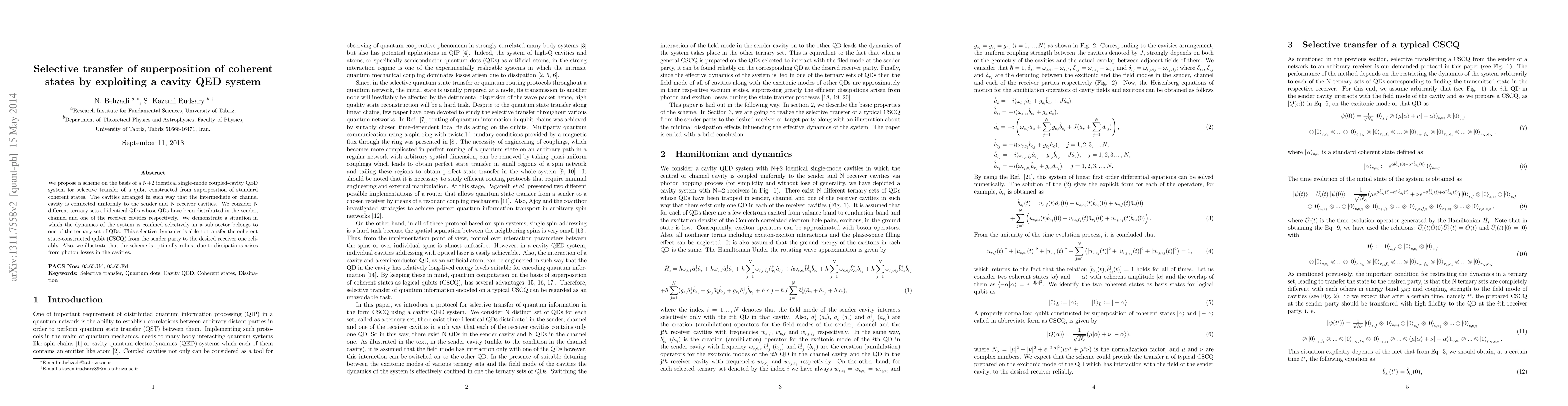 We propose a scheme on the basis of a N+2 identical single-mode coupled-cavity QED system for selective transfer of a qubit constructed from superposition of standard coherent states. The cavities arranged in such way that the intermediate or channel cavity is connected uniformly to the sender and N receiver cavities. We consider N different ternary sets of identical QDs whose QDs have been distributed in the sender, channel and one of the receiver cavities respectively. We demonstrate a situation in which the dynamics of the system is confined selectively in a sub sector belongs to one of the ternary set of QDs. This selective dynamics is able to transfer the coherent state-constructed qubit (CSCQ) from the sender party to the desired receiver one reliably. Also, we illustrate that the scheme is optimally robust due to dissipations arises from photon losses in the cavities.
