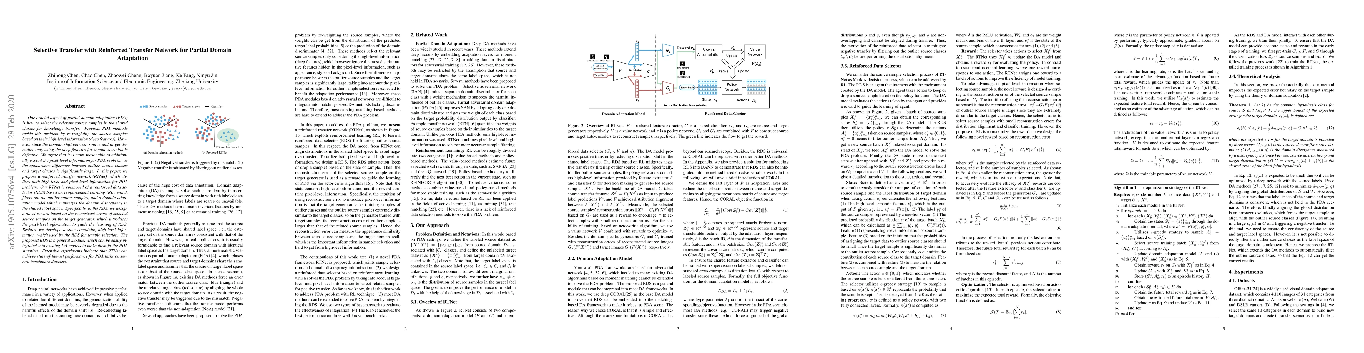 This paper introduces a Reinforced Transfer Network (RTNet) for Partial Domain Adaptation (PDA). RTNet combines high-level and pixel-level information using a reinforcement learning-based data selector to filter out irrelevant source samples, achieving state-of-the-art performance in PDA tasks on benchmark datasets.