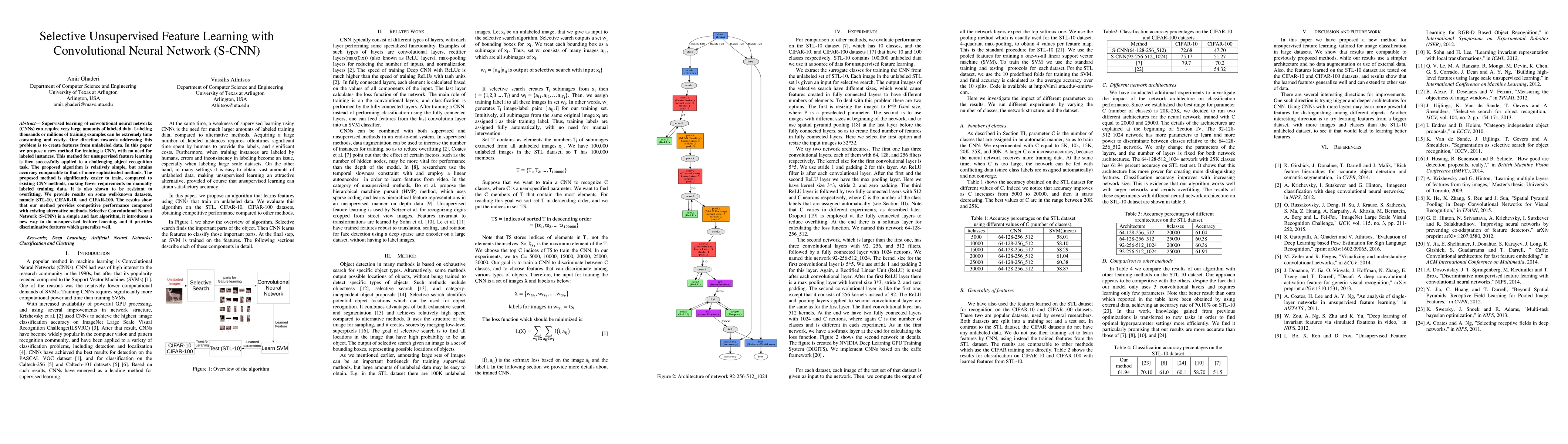This paper introduces a novel method called Selective Unsupervised Feature Learning with Convolutional Neural Network (S-CNN) to address the challenge of requiring large labeled datasets for supervised learning. The proposed method enables CNNs to train without labeled data, achieving competitive accuracy on object recognition tasks using datasets like STL-10, CIFAR-10, and CIFAR-100, while being easier to train and more resistant to overfitting compared to existing methods.