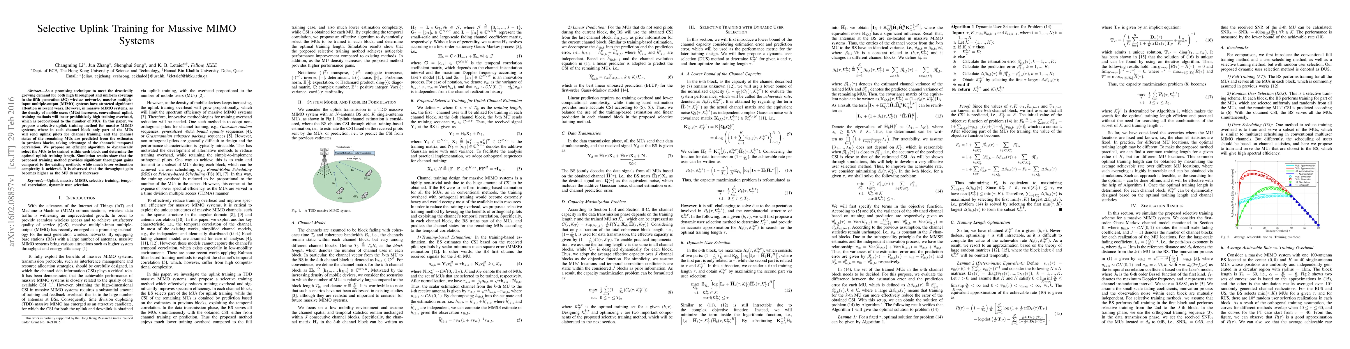 This paper proposes a selective uplink training method for massive MIMO systems to reduce training overhead, where only a subset of mobile users send pilots in each channel block, and others' channels are predicted based on temporal correlation. The method achieves significant throughput gains and lower complexity compared to conventional methods, especially with higher mobile user densities.