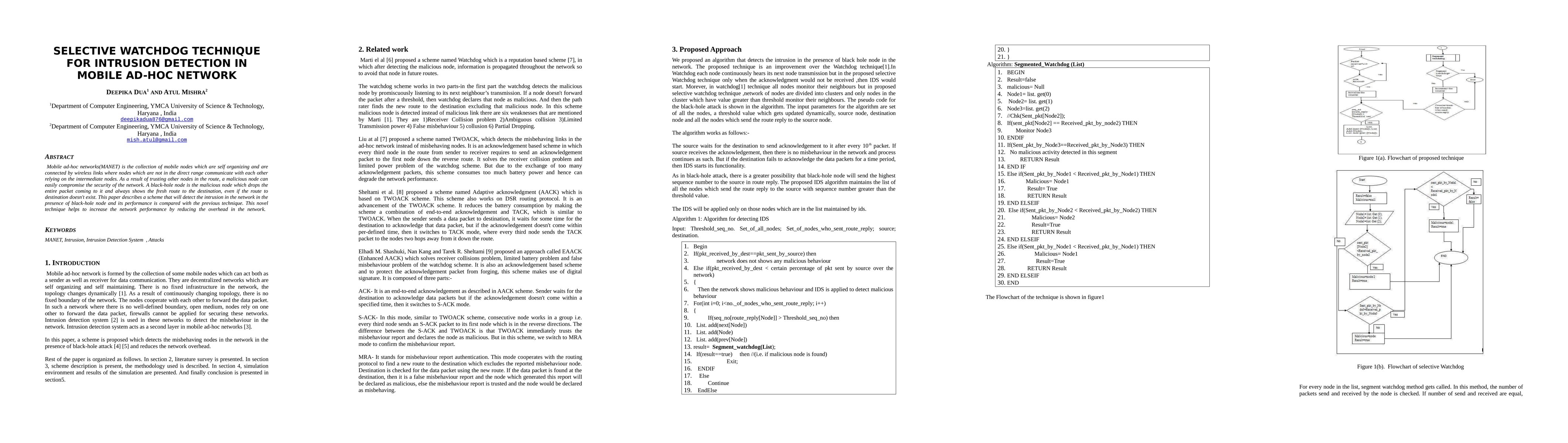 This paper proposes a selective watchdog technique to detect black-hole attacks in mobile ad-hoc networks (MANETs), enhancing network performance by reducing overhead compared to previous methods. The technique aims to improve intrusion detection efficiency in self-organizing networks where nodes rely on intermediate nodes.