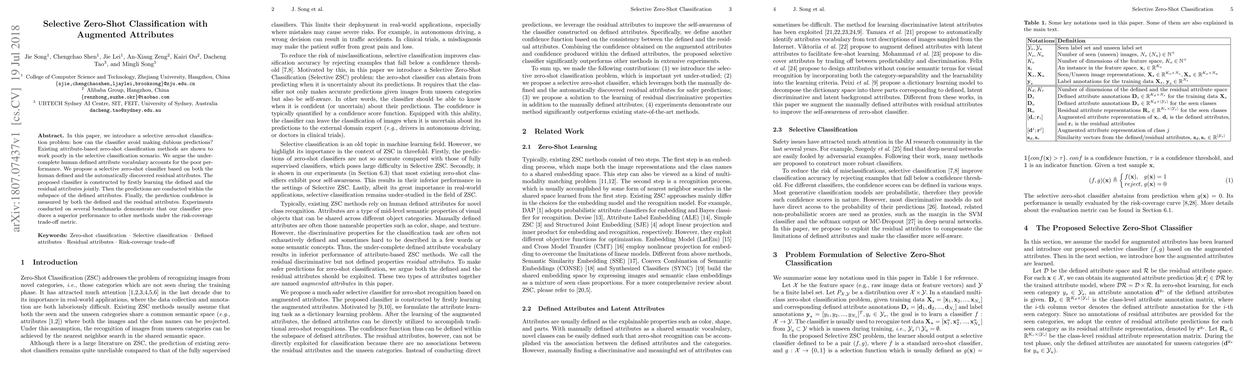This paper proposes a selective zero-shot classifier that combines human-defined attributes with automatically discovered residual attributes to improve classification accuracy and avoid dubious predictions. Experiments show superior performance compared to existing methods.
