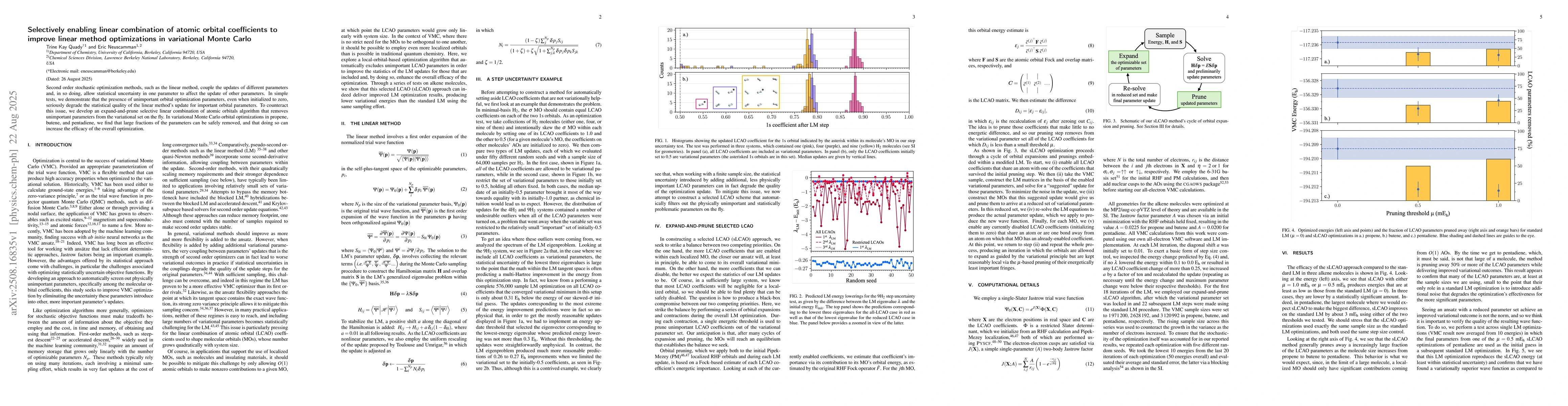 Second order stochastic optimization methods, such as the linear method, couple the updates of different parameters and, in so doing, allow statistical uncertainty in one parameter to affect the update of other parameters. In simple tests, we demonstrate that the presence of unimportant orbital optimization parameters, even when initialized to zero, seriously degrade the statistical quality of the linear method's update for important orbital parameters. To counteract this issue, we develop an expand-and-prune selective linear combination of atomic orbitals algorithm that removes unimportant parameters from the variational set on the fly. In variational Monte Carlo orbital optimizations in propene, butene, and pentadiene, we find that large fractions of the parameters can be safely removed, and that doing so can increase the efficacy of the overall optimization.