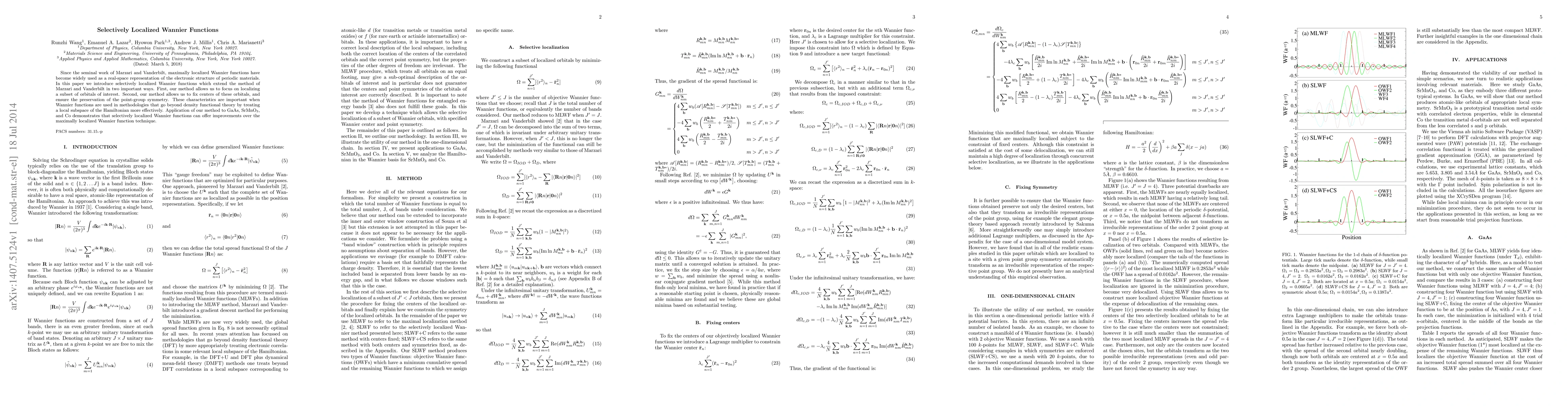 This paper introduces selectively localized Wannier functions, which allow for the localization of specific orbitals of interest while preserving point-group symmetry. Applications to GaAs, SrMnO$_3$, and Co show improvements over traditional maximally localized Wannier functions.