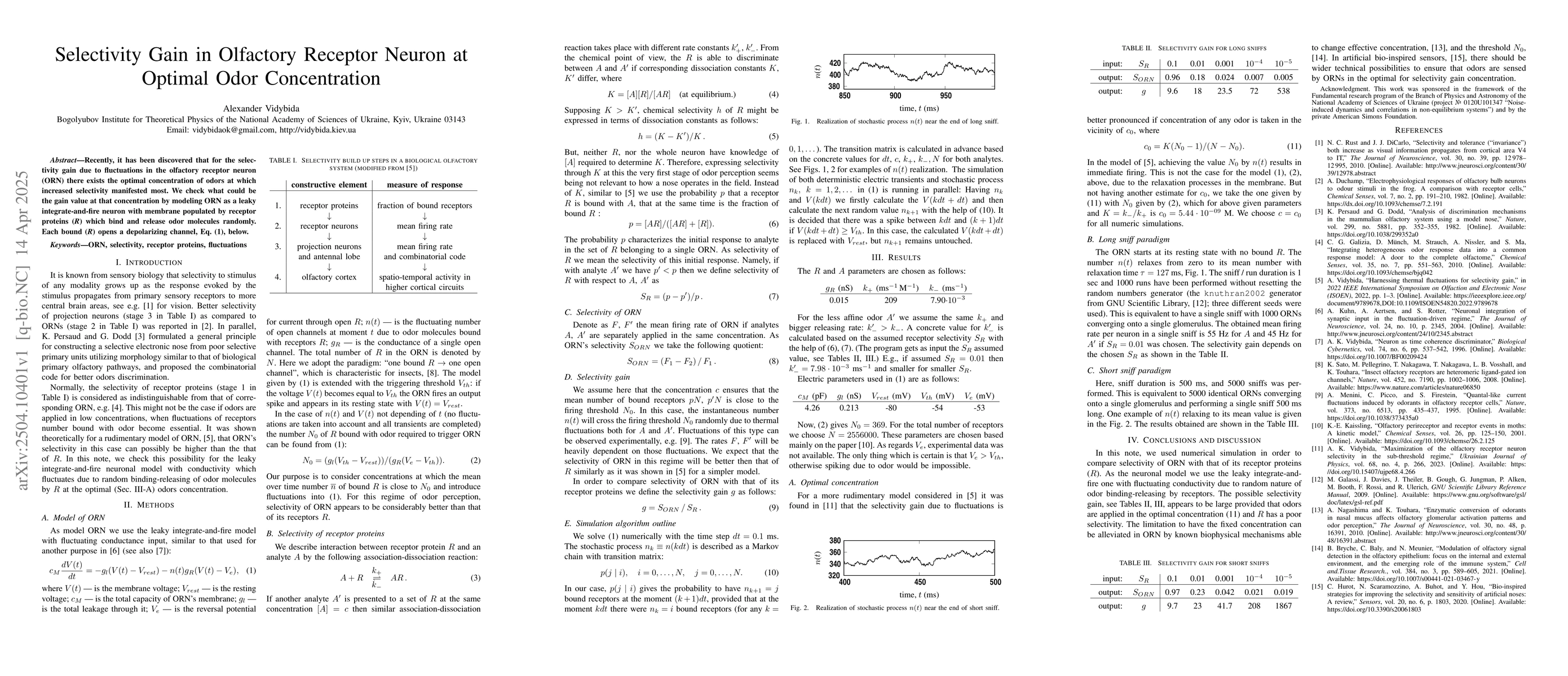 The paper introduces a numerical simulation approach using the leaky integrate-and-fire neuron model with fluctuating conductance to analyze selectivity gain in olfactory receptor neurons at optimal odor concentrations.