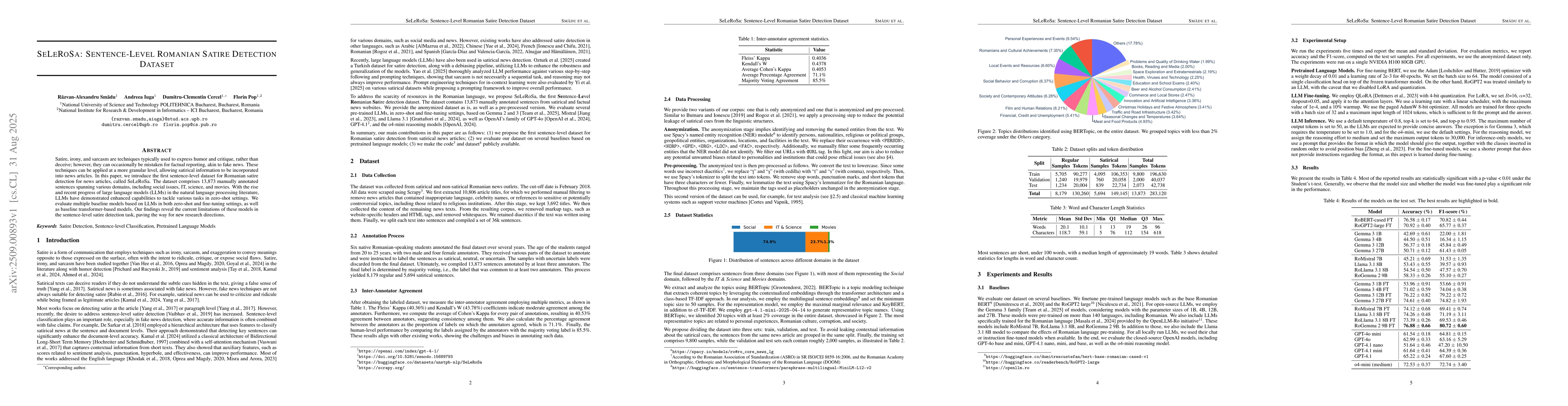 Satire, irony, and sarcasm are techniques typically used to express humor and critique, rather than deceive; however, they can occasionally be mistaken for factual reporting, akin to fake news. These techniques can be applied at a more granular level, allowing satirical information to be incorporated into news articles. In this paper, we introduce the first sentence-level dataset for Romanian satire detection for news articles, called SeLeRoSa. The dataset comprises 13,873 manually annotated sentences spanning various domains, including social issues, IT, science, and movies. With the rise and recent progress of large language models (LLMs) in the natural language processing literature, LLMs have demonstrated enhanced capabilities to tackle various tasks in zero-shot settings. We evaluate multiple baseline models based on LLMs in both zero-shot and fine-tuning settings, as well as baseline transformer-based models. Our findings reveal the current limitations of these models in the sentence-level satire detection task, paving the way for new research directions.