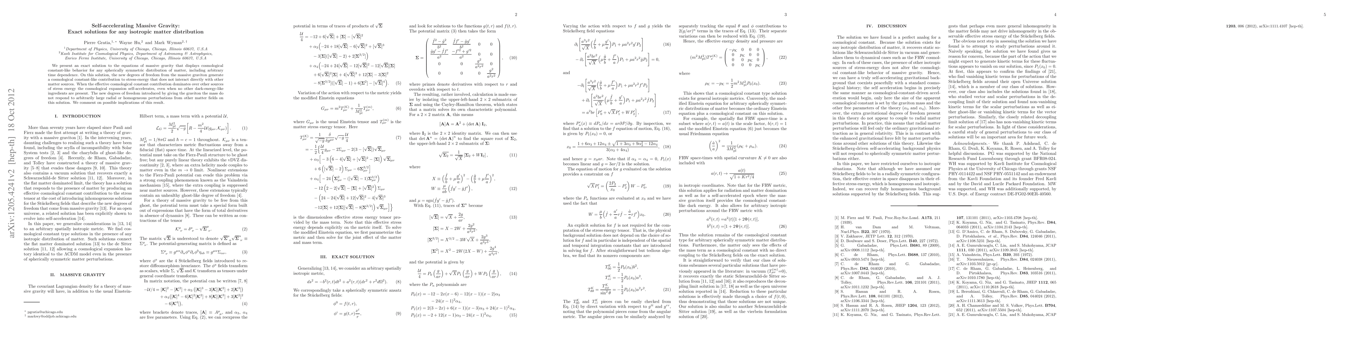 We present an exact solution to the equations of massive gravity that displays cosmological constant-like behavior for any spherically symmetric distribution of matter, including arbitrary time dependence. On this solution, the new degrees of freedom from the massive graviton generate a cosmological constant-like contribution to stress-energy that does not interact directly with other matter sources. When the effective cosmological constant contribution dominates over other sources of stress energy the cosmological expansion self-accelerates, even when no other dark-energy-like ingredients are present. The new degrees of freedom introduced by giving the graviton the mass do not respond to arbitrarily large radial or homogeneous perturbations from other matter fields on this solution. We comment on possible implications of this result.