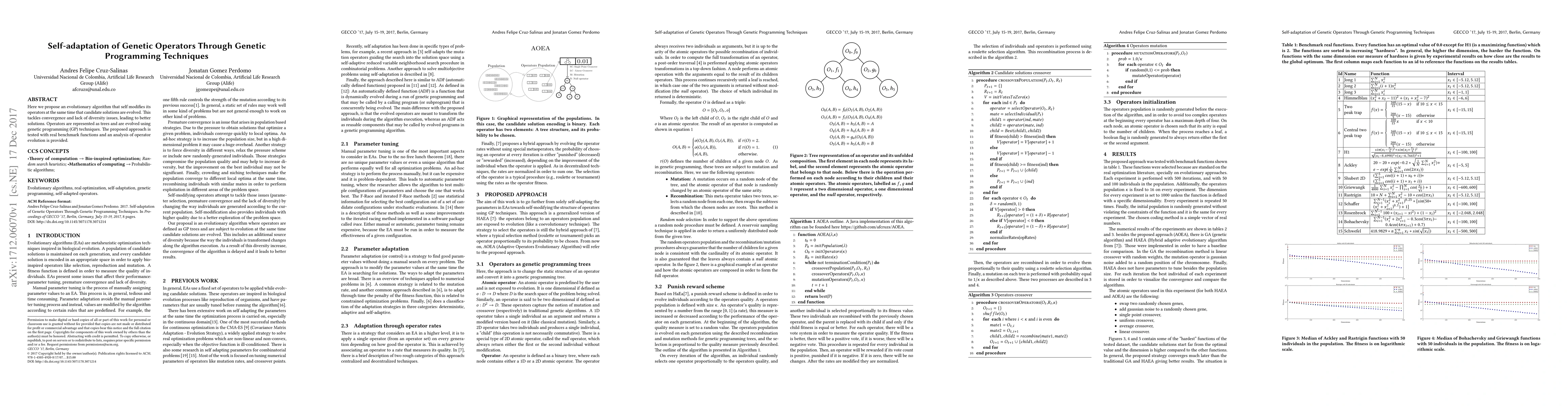 Here we propose an evolutionary algorithm that self modifies its operators at the same time that candidate solutions are evolved. This tackles convergence and lack of diversity issues, leading to better solutions. Operators are represented as trees and are evolved using genetic programming (GP) techniques. The proposed approach is tested with real benchmark functions and an analysis of operator evolution is provided.