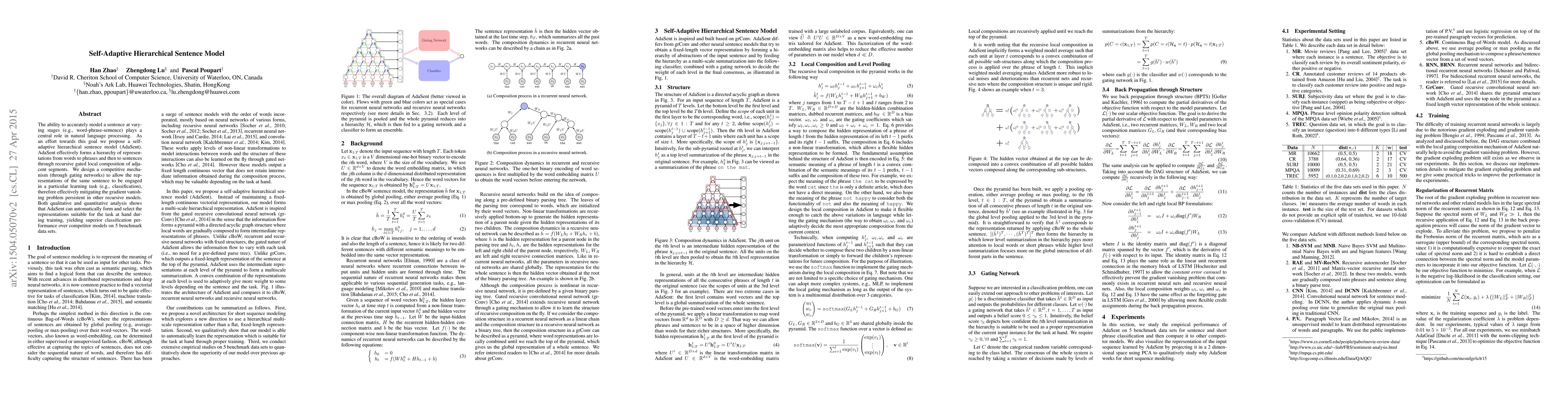 The ability to accurately model a sentence at varying stages (e.g., word-phrase-sentence) plays a central role in natural language processing. As an effort towards this goal we propose a self-adaptive hierarchical sentence model (AdaSent). AdaSent effectively forms a hierarchy of representations from words to phrases and then to sentences through recursive gated local composition of adjacent segments. We design a competitive mechanism (through gating networks) to allow the representations of the same sentence to be engaged in a particular learning task (e.g., classification), therefore effectively mitigating the gradient vanishing problem persistent in other recursive models. Both qualitative and quantitative analysis shows that AdaSent can automatically form and select the representations suitable for the task at hand during training, yielding superior classification performance over competitor models on 5 benchmark data sets.