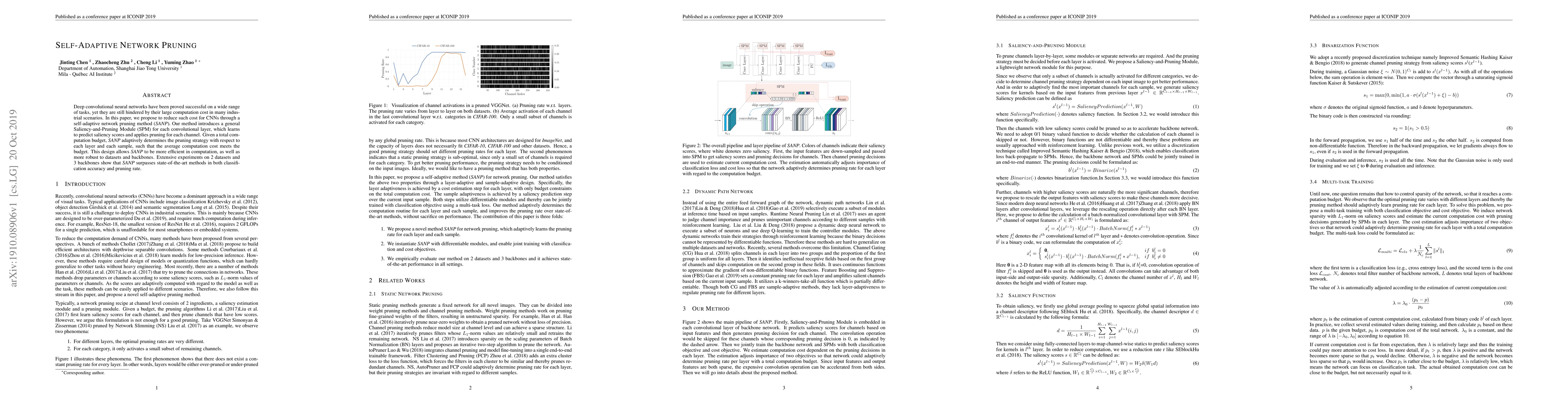 This paper proposes a self-adaptive network pruning method (SANP) to reduce computation costs in deep CNNs by introducing a Saliency-and-Pruning Module (SPM) that learns to predict saliency scores and adaptively prunes channels. SANP achieves efficient computation and robustness across different datasets and network architectures, outperforming state-of-the-art methods in accuracy and pruning rate.