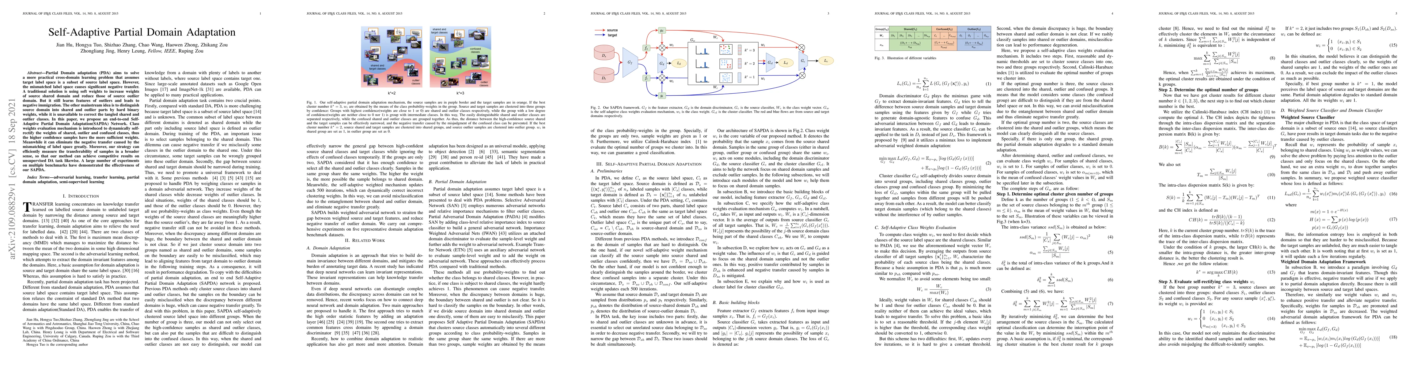 A new approach called Self-Adaptive Partial Domain Adaptation (SAPDA) is proposed to adapt to two domains with different labels, eliminating negative transfer and improving performance on unsupervised domain adaptation tasks.