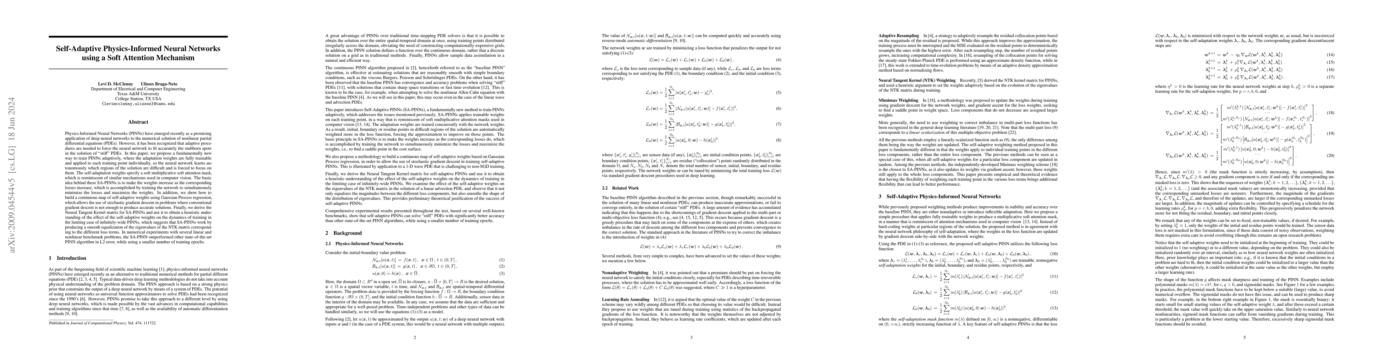 This paper proposes self-adaptive Physics-Informed Neural Networks (SA-PINNs) with a soft attention mechanism to improve the accuracy of solving stiff PDEs. The adaptive weights focus on difficult regions by increasing as corresponding losses rise, enhancing training efficiency.