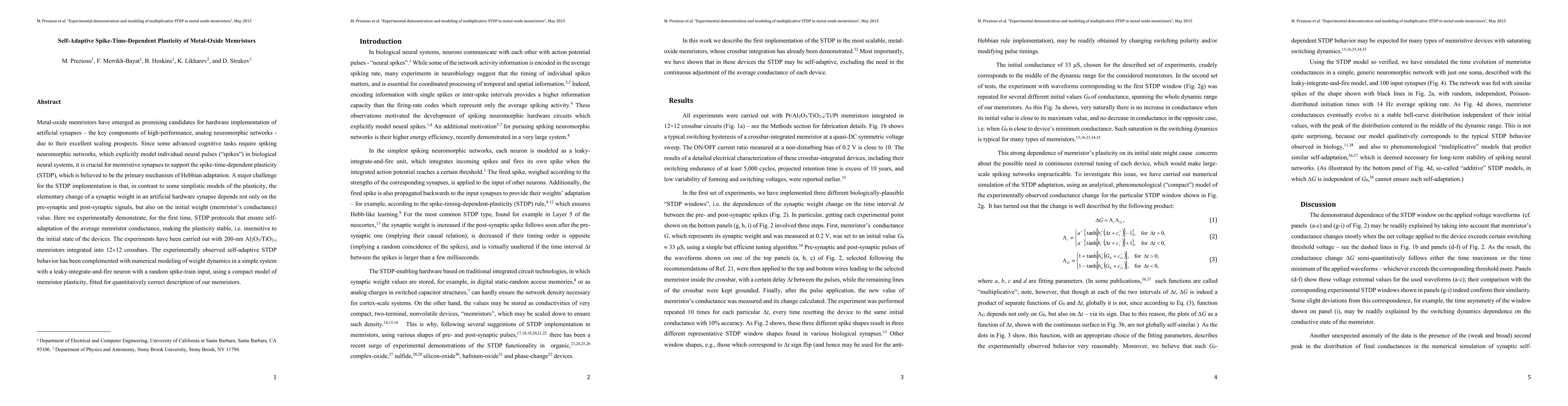 This paper demonstrates self-adaptive spike-time-dependent plasticity (STDP) in metal-oxide memristors, crucial for artificial synapses in neuromorphic networks. The experiments show stable plasticity independent of initial memristor conductance, validated through numerical modeling of memristor weight dynamics.