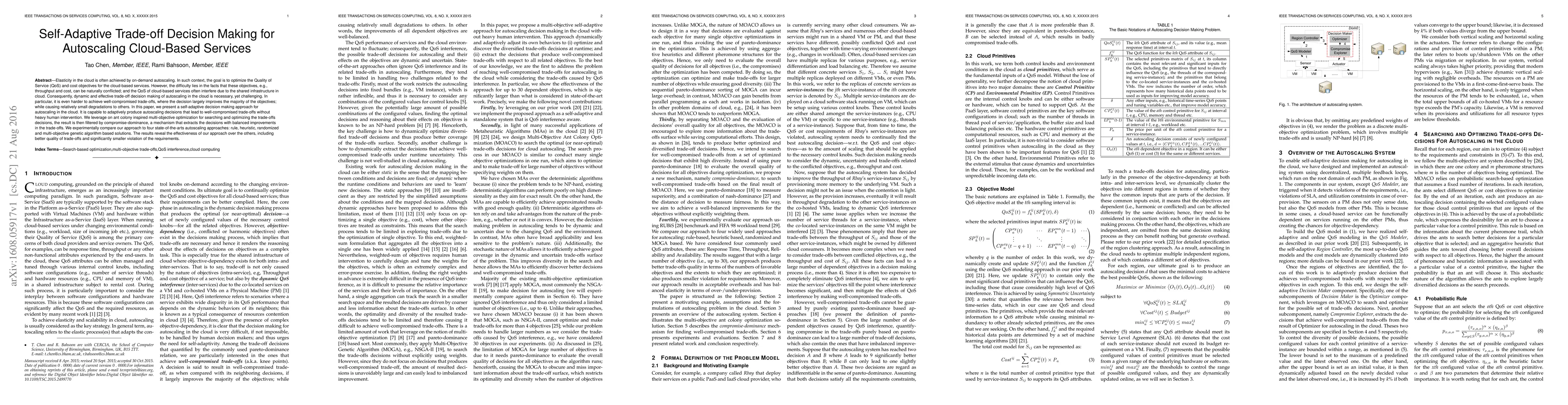 This paper introduces a self-adaptive method for making trade-off decisions in autoscaling cloud services, employing ant colony optimization to balance QoS and cost objectives. Experimental results show its superior performance compared to other autoscaling techniques.