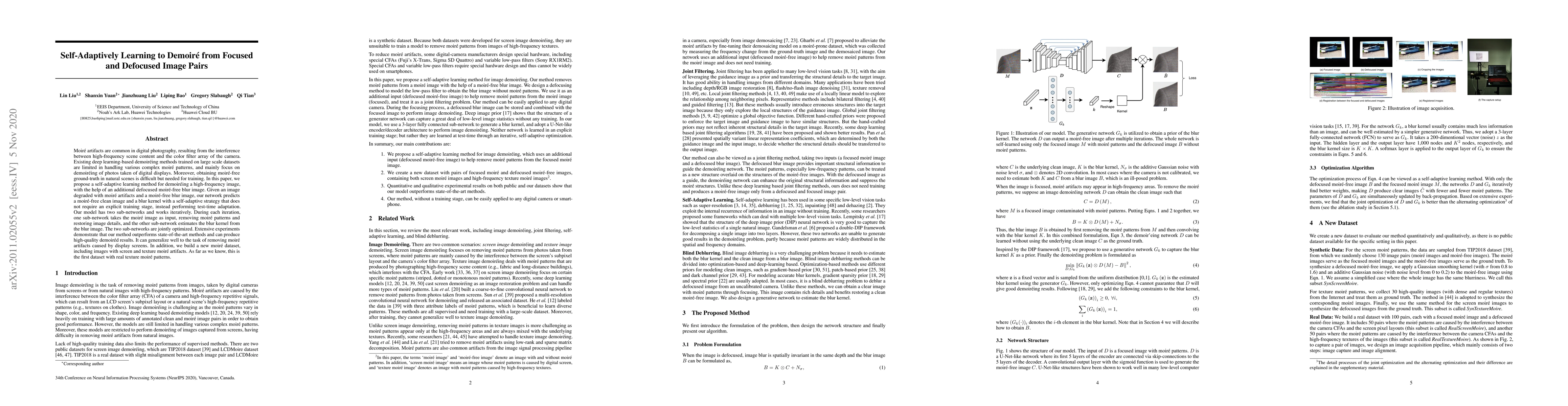 Moire artifacts are common in digital photography, resulting from the interference between high-frequency scene content and the color filter array of the camera. Existing deep learning-based demoireing methods trained on large scale datasets are limited in handling various complex moire patterns, and mainly focus on demoireing of photos taken of digital displays. Moreover, obtaining moire-free ground-truth in natural scenes is difficult but needed for training. In this paper, we propose a self-adaptive learning method for demoireing a high-frequency image, with the help of an additional defocused moire-free blur image. Given an image degraded with moire artifacts and a moire-free blur image, our network predicts a moire-free clean image and a blur kernel with a self-adaptive strategy that does not require an explicit training stage, instead performing test-time adaptation. Our model has two sub-networks and works iteratively. During each iteration, one sub-network takes the moire image as input, removing moire patterns and restoring image details, and the other sub-network estimates the blur kernel from the blur image. The two sub-networks are jointly optimized. Extensive experiments demonstrate that our method outperforms state-of-the-art methods and can produce high-quality demoired results. It can generalize well to the task of removing moire artifacts caused by display screens. In addition, we build a new moire dataset, including images with screen and texture moire artifacts. As far as we know, this is the first dataset with real texture moire patterns.