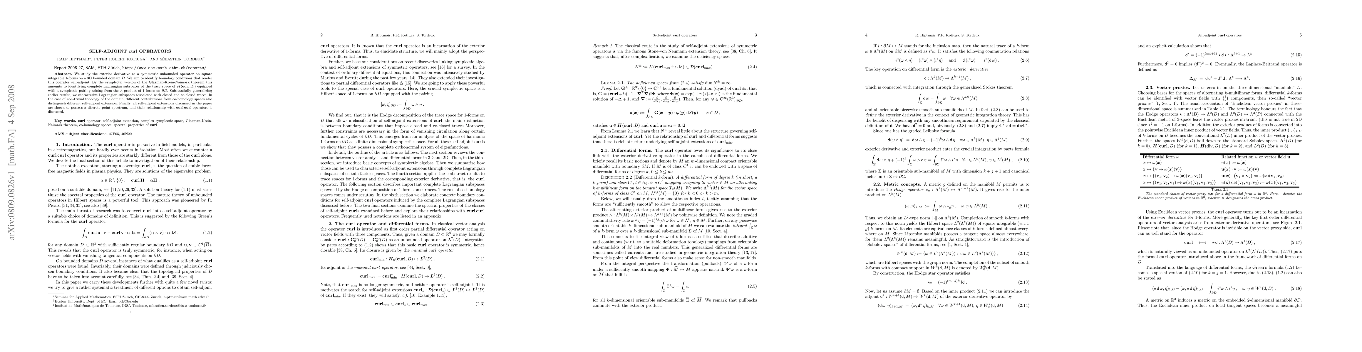 We study the exterior derivative as a symmetric unbounded operator on square integrable 1-forms on a 3D bounded domain $D$. We aim to identify boundary conditions that render this operator self-adjoint. By the symplectic version of the Glazman-Krein-Naimark theorem this amounts to identifying complete Lagrangian subspaces of the trace space of H(curl) equipped with a symplectic pairing arising from the $\wedge$-product of 1-forms on $\partial D$. Substantially generalizing earlier results, we characterize Lagrangian subspaces associated with closed and co-closed traces. In the case of non-trivial topology of the domain, different contributions from co-homology spaces also distinguish different self-adjoint extension. Finally, all self-adjoint extensions discussed in the paper are shown to possess a discrete point spectrum, and their relationship with curl curl-operators is discussed.