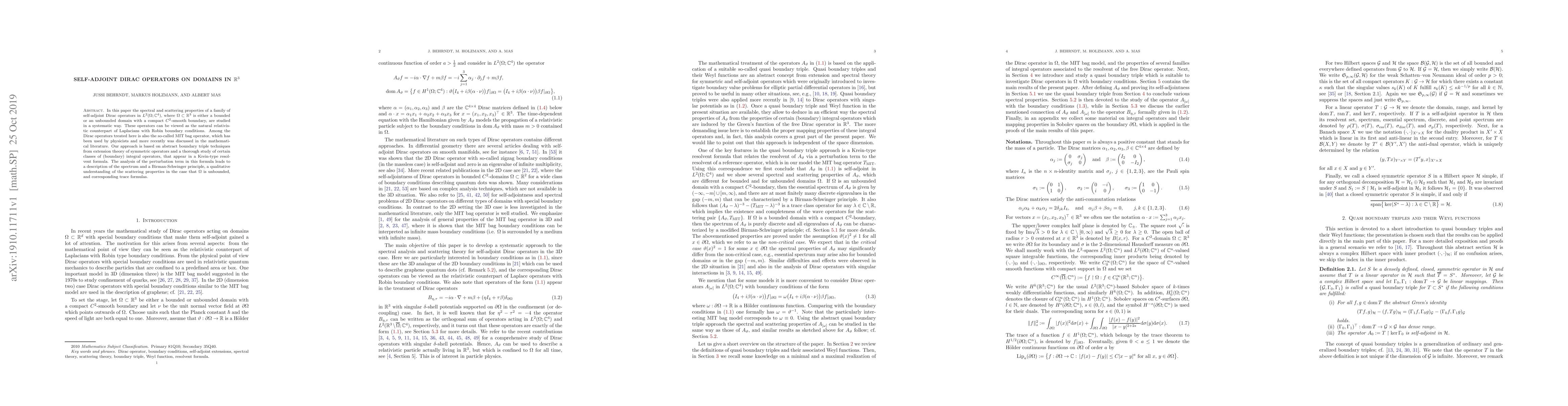 This paper studies the spectral and scattering properties of self-adjoint Dirac operators on domains in 3D space, with a focus on their applications to quantum physics and mathematical analysis.