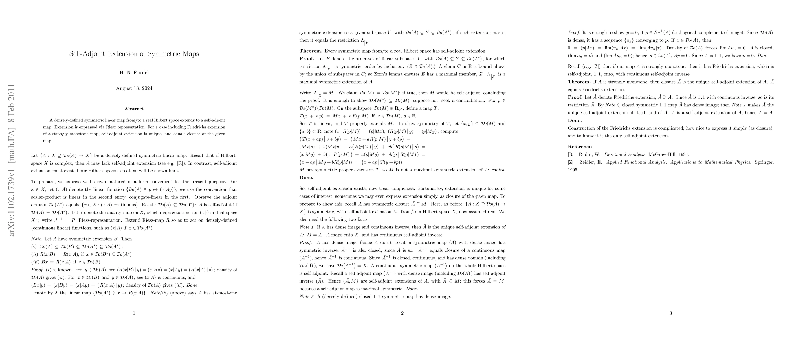 Summary: This paper discusses the extension of densely-defined symmetric linear maps in real Hilbert spaces to self-adjoint maps using Riesz representation, with a focus on the unique self-adjoint extension via Friedrichs extension for strongly monotone maps.