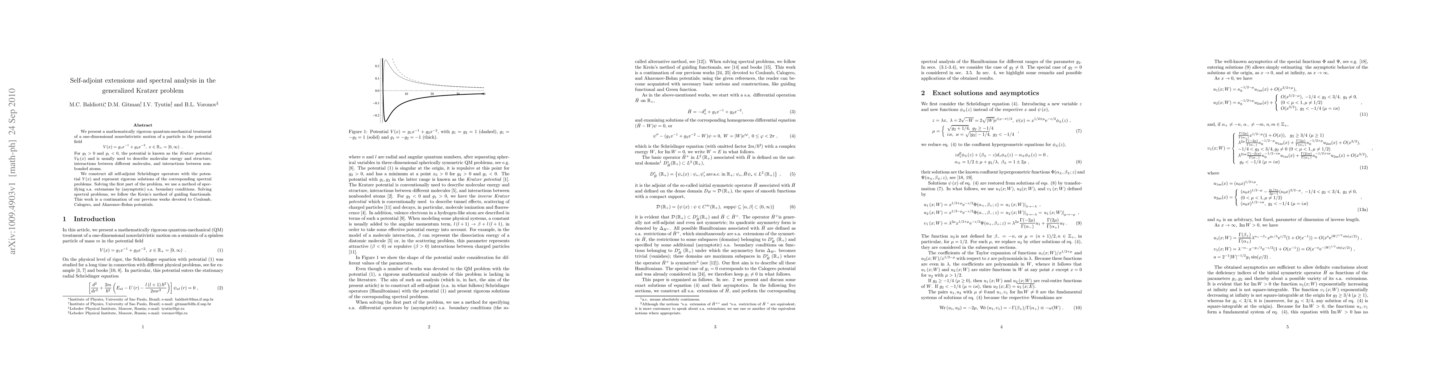 We present a mathematically rigorous quantum-mechanical treatment of a one-dimensional nonrelativistic motion of a particle in the potential field $V(x)=g_{1}x^{-1}+g_{2}x^{-2}$. For $g_{2}>0$ and $g_{1}<0$, the potential is known as the Kratzer potential and is usually used to describe molecular energy and structure, interactions between different molecules, and interactions between non-bonded atoms. We construct all self-adjoint Schrodinger operators with the potential $V(x)$ and represent rigorous solutions of the corresponding spectral problems. Solving the first part of the problem, we use a method of specifying s.a. extensions by (asymptotic) s.a. boundary conditions. Solving spectral problems, we follow the Krein's method of guiding functionals. This work is a continuation of our previous works devoted to Coulomb, Calogero, and Aharonov-Bohm potentials.