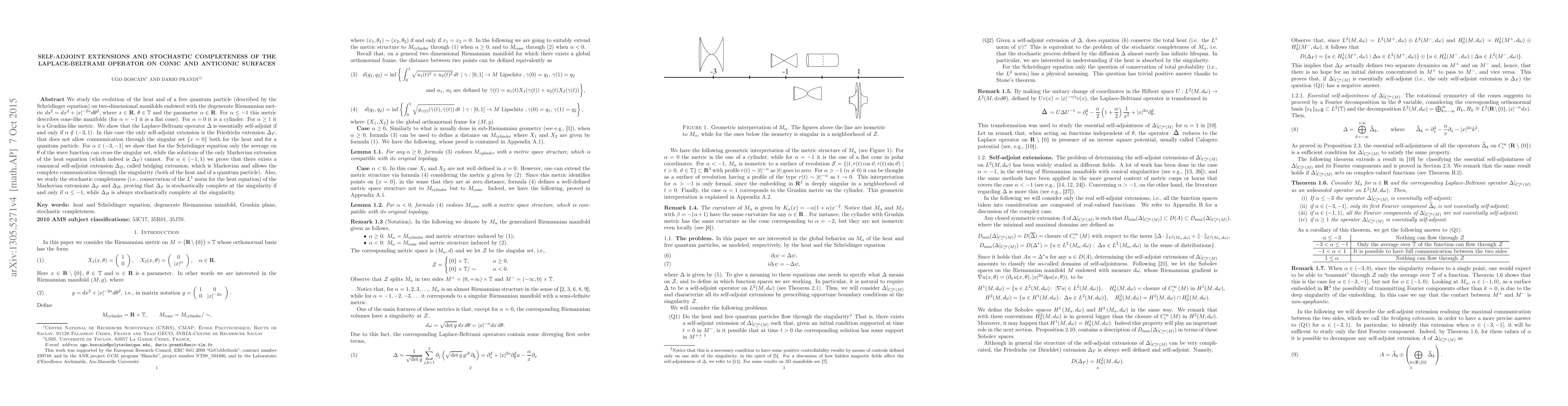 This paper studies the behavior of the Laplace-Beltrami operator on conic and anticonic surfaces, finding that certain extensions allow for stochastic completeness and communication through singularities in specific parameter ranges.