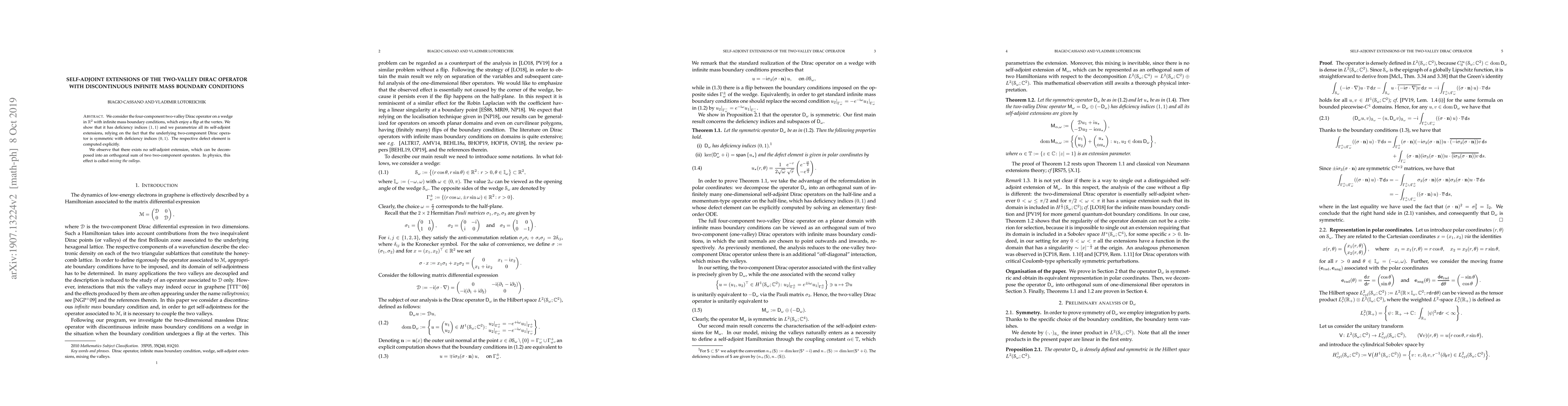 Title: Self-adjoint extensions of the two-valley Dirac operator with discontinuous infinite mass boundary conditions Summary: This paper investigates the self-adjoint extensions of a two-valley Dirac operator with infinite mass boundary conditions exhibiting a flip at the vertex, finding $(1,1)$ deficiency indices and parametrizing all extensions. It reveals no self-adjoint extension that decomposes into orthogonal valley sums, a phenomenon referred to as valley mixing in physics.
