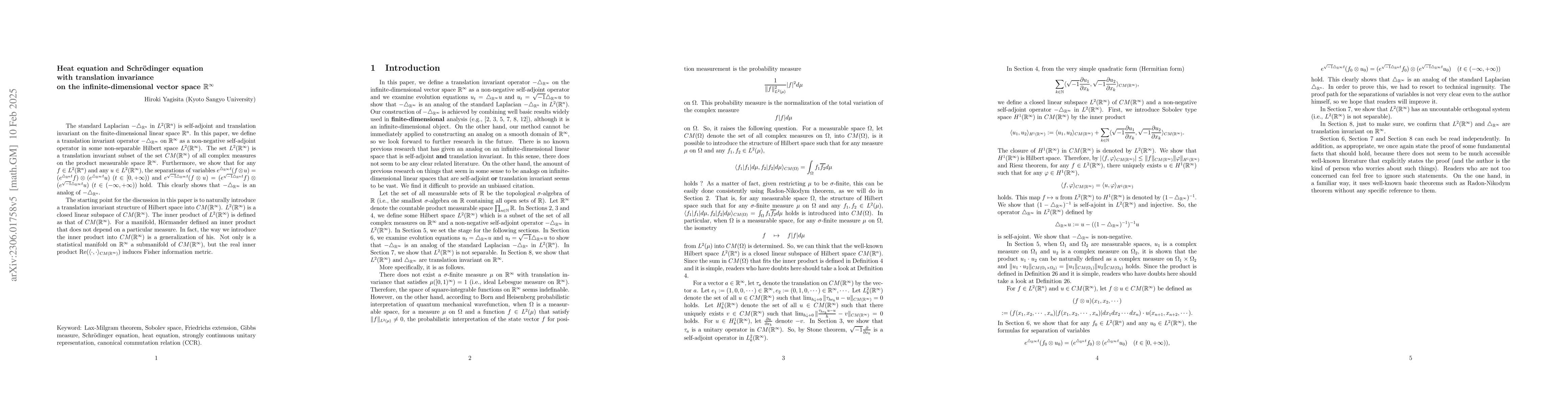 The standard Laplacian $-\triangle_{\mathbb R^n}$ in $L^2(\mathbb R^n)$ is self-adjoint and translation invariant on the finite-dimensional vector space $\mathbb R^n$. In this paper, using some quadratic form, we define a translation invariant operator $-\triangle_{\mathbb R^\infty}$ on $\mathbb R^\infty$ as a non-negative self-adjoint operator in some Hilbert space $L^2(\mathbb R^\infty)$, which is a subset of the set $CM(\mathbb R^\infty)$ of all complex measures on the product measurable space $\mathbb R^\infty$. Furthermore, we show that for any $f\in L^2(\mathbb R^n)$ and any $u\in L^2(\mathbb R^\infty)$, $e^{\sqrt{-1}\triangle_{\mathbb R^\infty}t}(f\otimes u) =(e^{\sqrt{-1}\triangle_{\mathbb R^n}t}f)\otimes (e^{\sqrt{-1}\triangle_{\mathbb R^\infty}t}u) \ (t\in (-\infty,+\infty))$ and $e^{\triangle_{\mathbb R^\infty}t}(f\otimes u)=(e^{\triangle_{\mathbb R^n}t}f)\otimes (e^{\triangle_{\mathbb R^\infty}t}u) \ (t\in [0,+\infty))$ hold. This clearly shows that $-\triangle_{\mathbb R^\infty}$ is an analog of $-\triangle_{\mathbb R^n}$. The starting point for the discussion in this paper is to naturally introduce a translation invariant Hilbert space structure into $CM(\mathbb R^\infty)$.