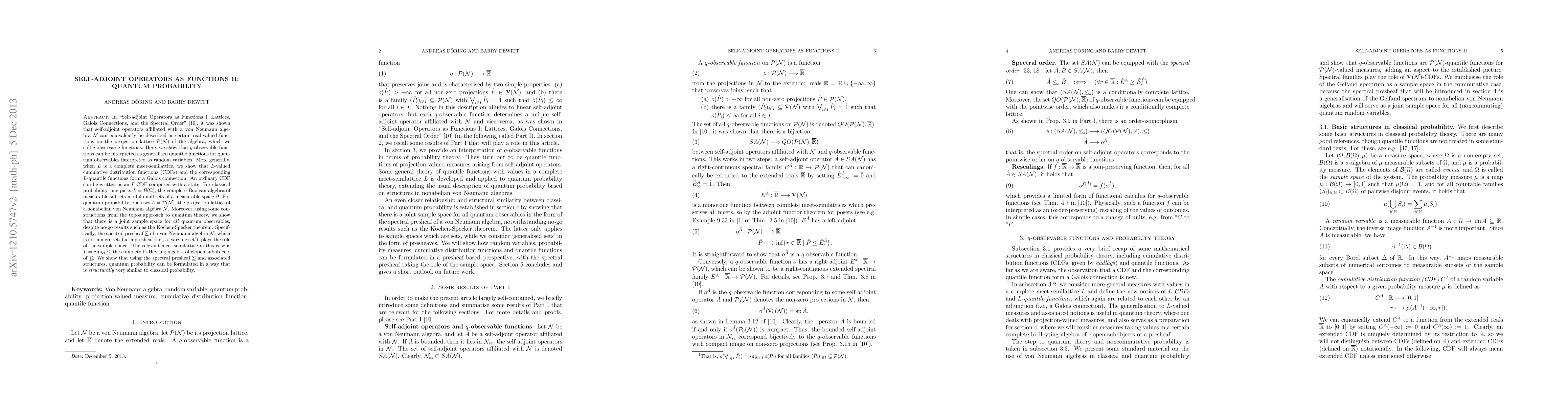 In "Self-adjoint Operators as Functions I: Lattices, Galois Connections, and the Spectral Order" [arXiv:1208.4724], it was shown that self-adjoint operators affiliated with a von Neumann algebra N can equivalently be described as certain real-valued functions on the projection lattice P(N) of the algebra, which we call q-observable functions. Here, we show that q-observable functions can be interpreted as generalised quantile functions for quantum observables interpreted as random variables. More generally, when L is a complete meet-semilattice, we show that L-valued cumulative distribution functions and the corresponding L-quantile functions form a Galois connection. An ordinary CDF can be written as an L-CDF composed with a state. For classical probability, one picks L=B(\Omega), the complete Boolean algebra of measurable subsets modulo null sets of a measurable space \Omega. For quantum probability, one uses L=P(N), the projection lattice of a nonabelian von Neumann algebra N. Moreover, using some constructions from the topos approach to quantum theory, we show that there is a joint sample space for all quantum observables, despite no-go results such as the Kochen-Specker theorem. Specifically, the spectral presheaf \Sigma\ of a von Neumann algebra N, which is not a mere set, but a presheaf (i.e., a 'varying set'), plays the role of the sample space. The relevant meet-semilattice L in this case is the complete bi-Heyting algebra of clopen subobjects of \Sigma. We show that using the spectral presheaf \Sigma\ and associated structures, quantum probability can be formulated in a way that is structurally very similar to classical probability.